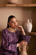 This 2 piece plum ensemble radiates graceful sophistication with its fully embroidered shirt, beautifully finished with delicate lace and tassel details. The intricate embroidery adds depth and texture, while the soft flow of the fabric enhances the outfit's refined elegance.