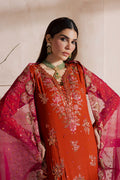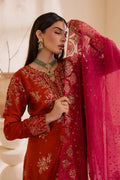 This 3-piece ensemble embodies rich sophistication with its deep rust paneled raw silk shirt, beautifully adorned with heavy thread, tilla, and sequin embroidery. The intricate craftsmanship reflects timeless elegance, while the deep hue brings warmth and depth to the design. The neckline, sleeve hems, and chaak are elevated with printed piping, tilla lace, and crystal embellishments, creating a refined balance of texture and sparkle.