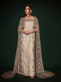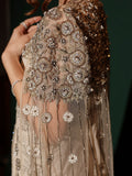 The flowing cape, a dramatic flourish of embellished shoulders, adds a touch of ethereal drama, completing this ensemble of pure enchantment. Featuring Ayesha Omar, this gown embodies the essence of nobility and sophistication, a testament to timeless grace.