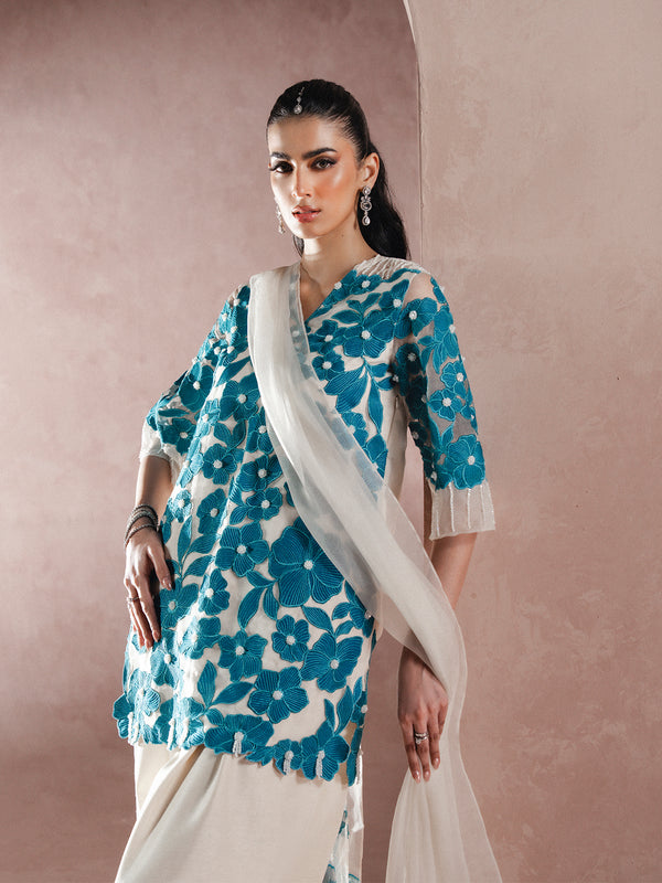 This shalwar kameez beautifully merges modern technique; patchwork with the timeless Pakistani silhouette, adorned with unique uncut crystals and pearls on organza shirt and dupatta with raw silk trouser making it a perfect choice for celebrations.
