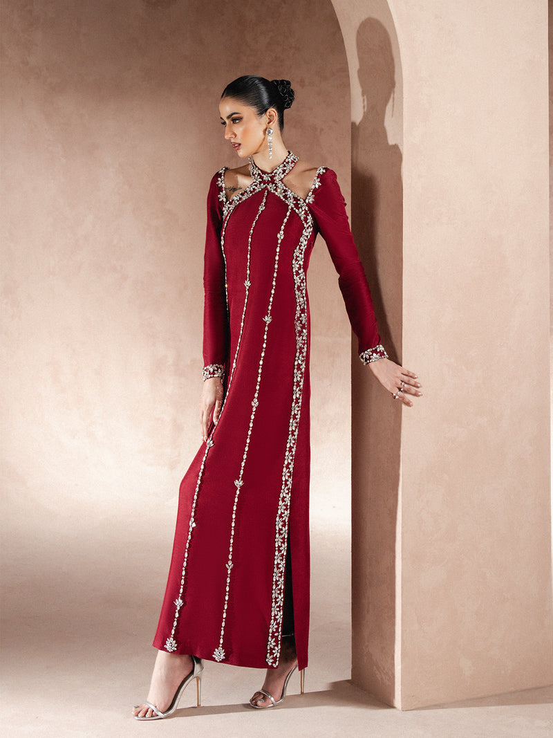 This design exudes contemporary elegance, elevated by meticulous linear placements of shimmering stones on raw silk with flowy medium silk dupatta, catching the light with every step and adding a touch of modern glamour to the ensemble.