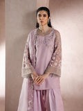 This light lilac dress beautifully embodies comfort and understated elegance, featuring a delicate floral design in a minimal aesthetic. The ensemble includes an airy organza shirt and dupatta, paired with a refined raw silk shalwar a graceful balance of texture and tone