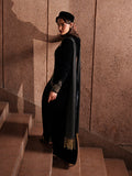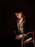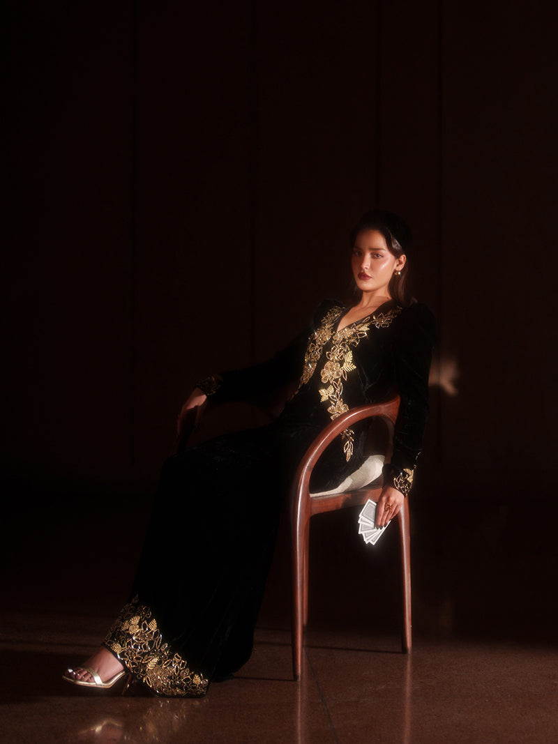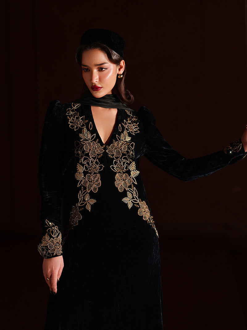 A black velvet dress as dark as the night, embellished to shine like glittering stars, creates the perfect statement for evening wear. The rich velvet texture enhances its dramatic and luxurious appeal. Paired with a silk long scarf finished with handmade tassels, the look is completed with timeless nighttime elegance.