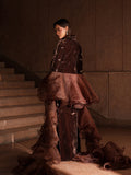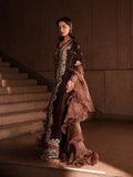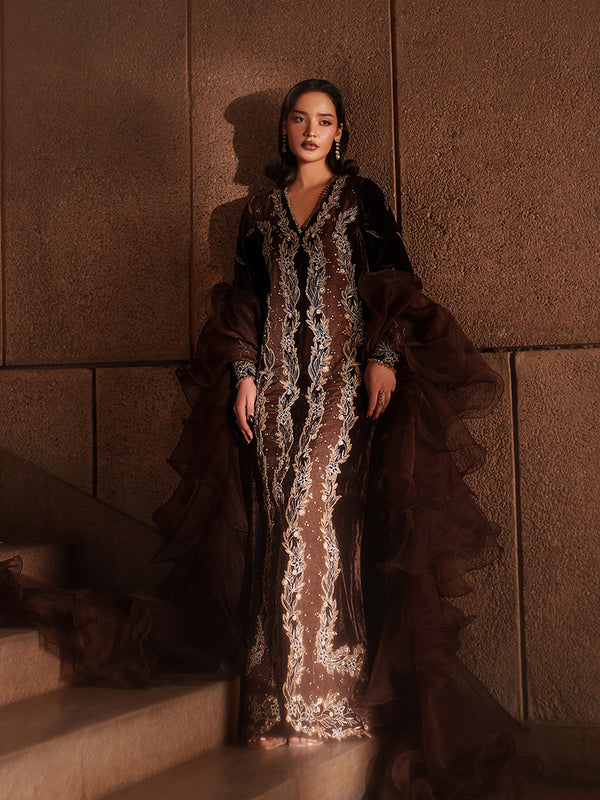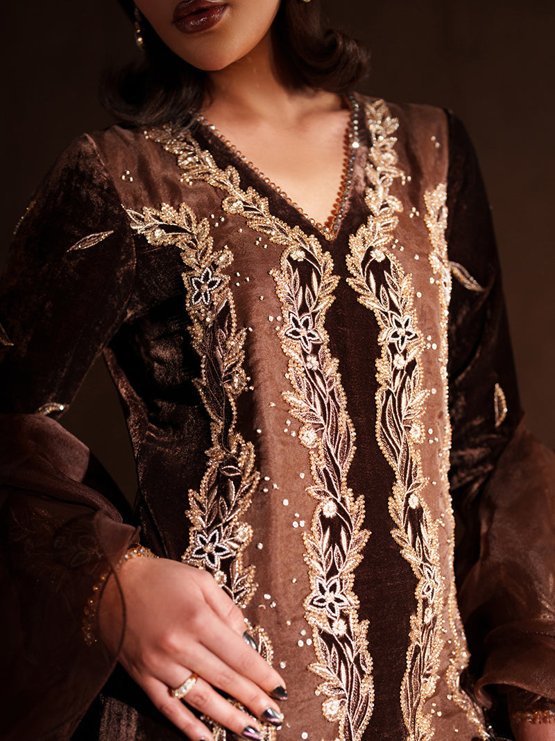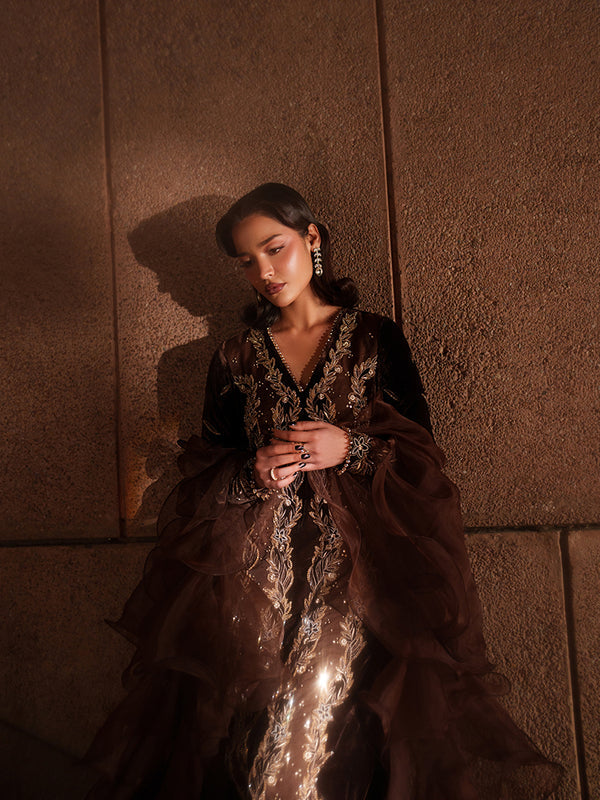 This unique coffee brown velvet dress with matching trousers is crafted using an intricate patchwork technique and richly embellished with crystals and sequins. The plush velvet texture adds depth and luxury, creating a statement silhouette. Paired with an experimental organza ruffled dupatta, the look is elevated with dramatic elegance and modern flair.