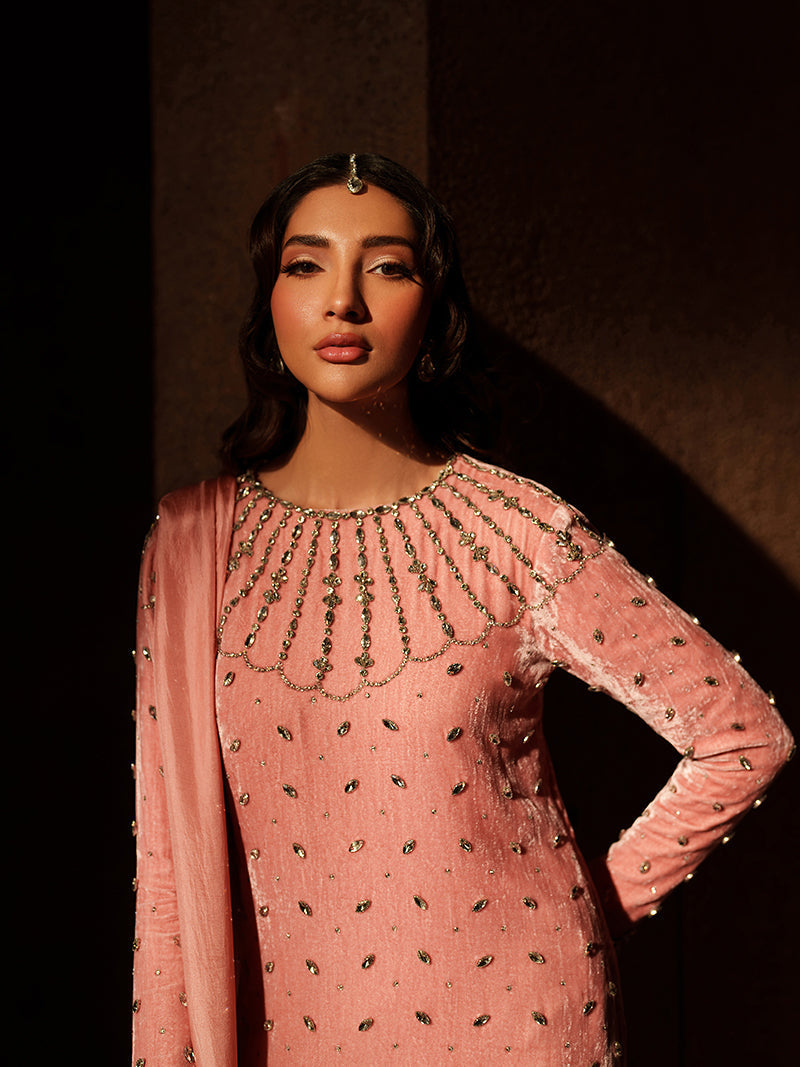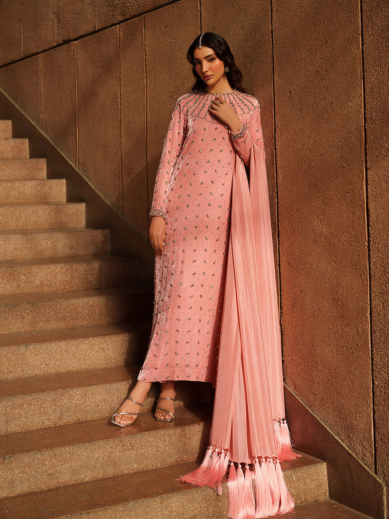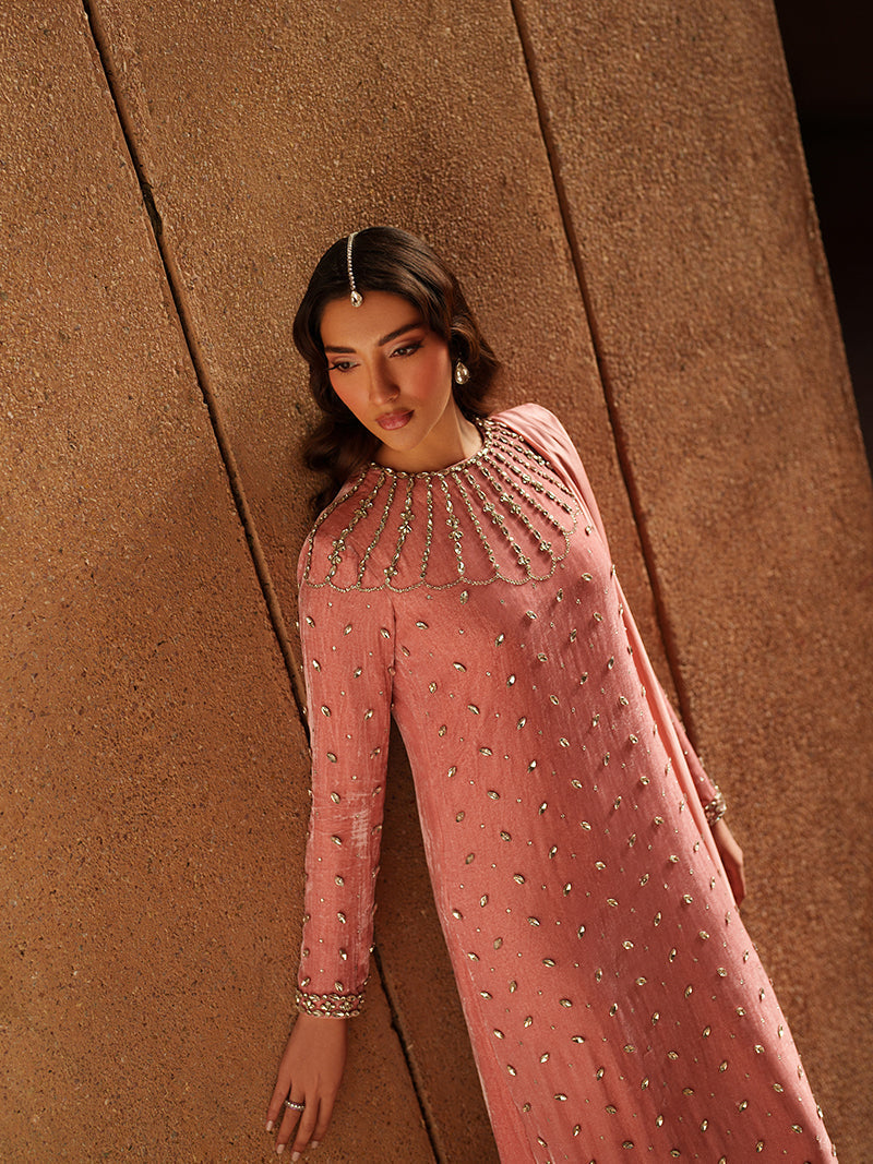 This bright pink crystal outfit, sparkling with every detail, perfectly captures a luminous personality and a taste for luxury. The vibrant hue adds a cheerful yet elegant touch, making it ideal for both morning and evening occasions. Paired with a pink silk dupatta finished with delicate tassels, the ensemble exudes refined charm and sophistication.