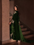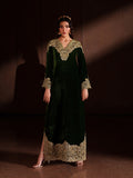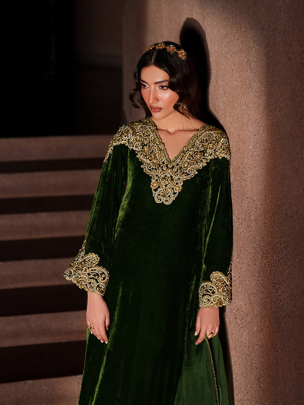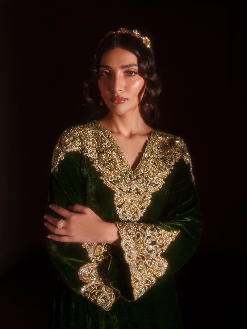 Velvet in a rich henna green tone brings depth and elegance to this dress, showcasing a seamless fusion of traditional handwork and modern cutlines. The refined craftsmanship highlights its timeless yet contemporary appeal. Paired with a sheer organza dupatta, the ensemble is completed with effortless sophistication.