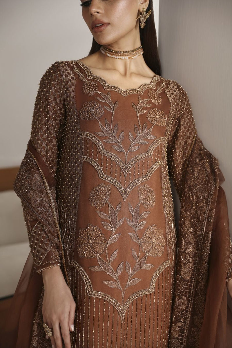 Imagine yourself walking down the aisle, bathed in the warm glow of the sunset. You're wearing the "Amber Dreams" hand-embroidered organza bridal ensemble and it feels like magic. This isn't just a dress, it's a masterpiece of craftsmanship that will take your breath away. The flowing organza shirt and dupatta are a breathtaking canvas adorned with intricate hand embroidery, shimmering tilla work and dazzling embellishments. Pearls, crystals, cutdana and sequins catch the light like a thousand stars, creating a mesmerizing shimmer that reflects the joy of this special day.