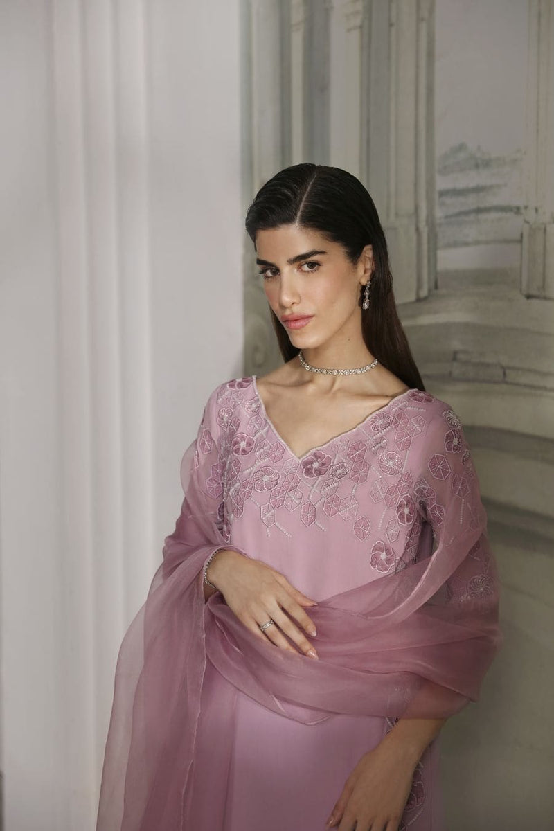 Indulge in the enchantment of this elegant chiffon dress. Adorned with intricate hand embroidery and embellished with delicate crystals, pearls, and sequins, this dress is more than just clothing; it's a masterpiece of craftsmanship. You'll feel confident and beautiful in this outfit, ready to make a lasting impression.