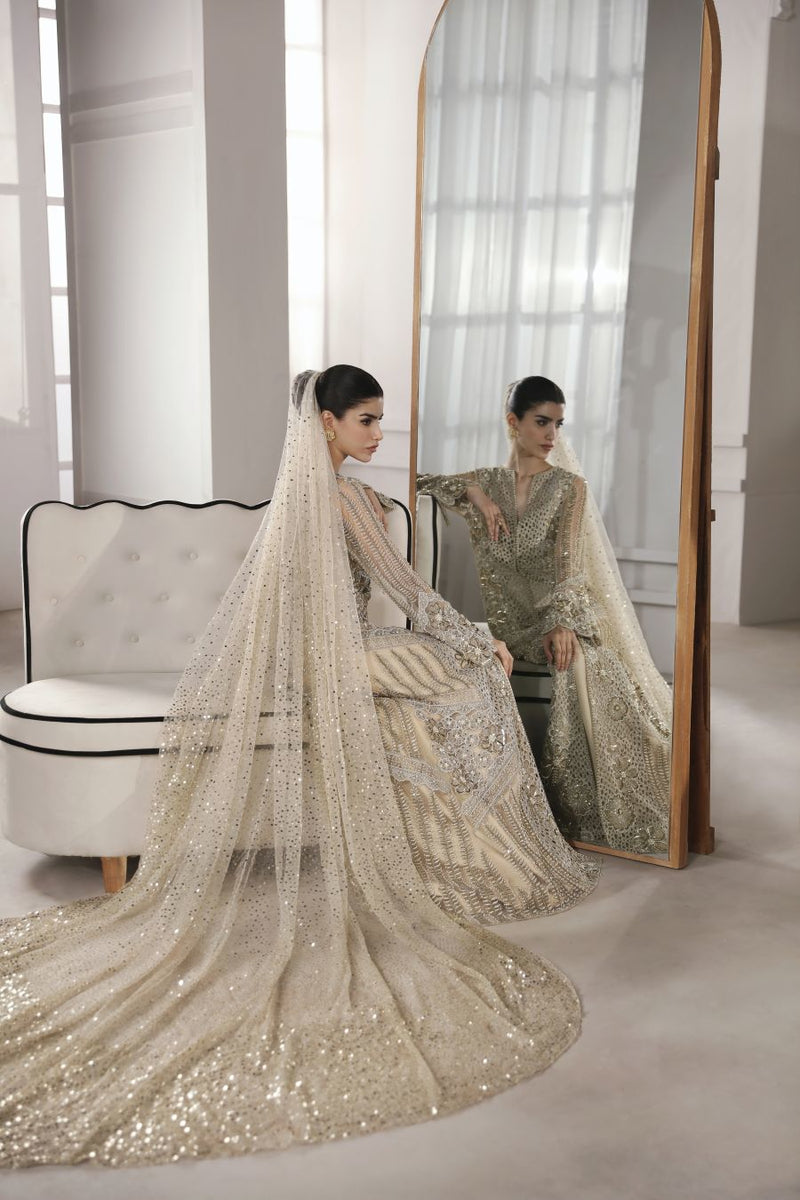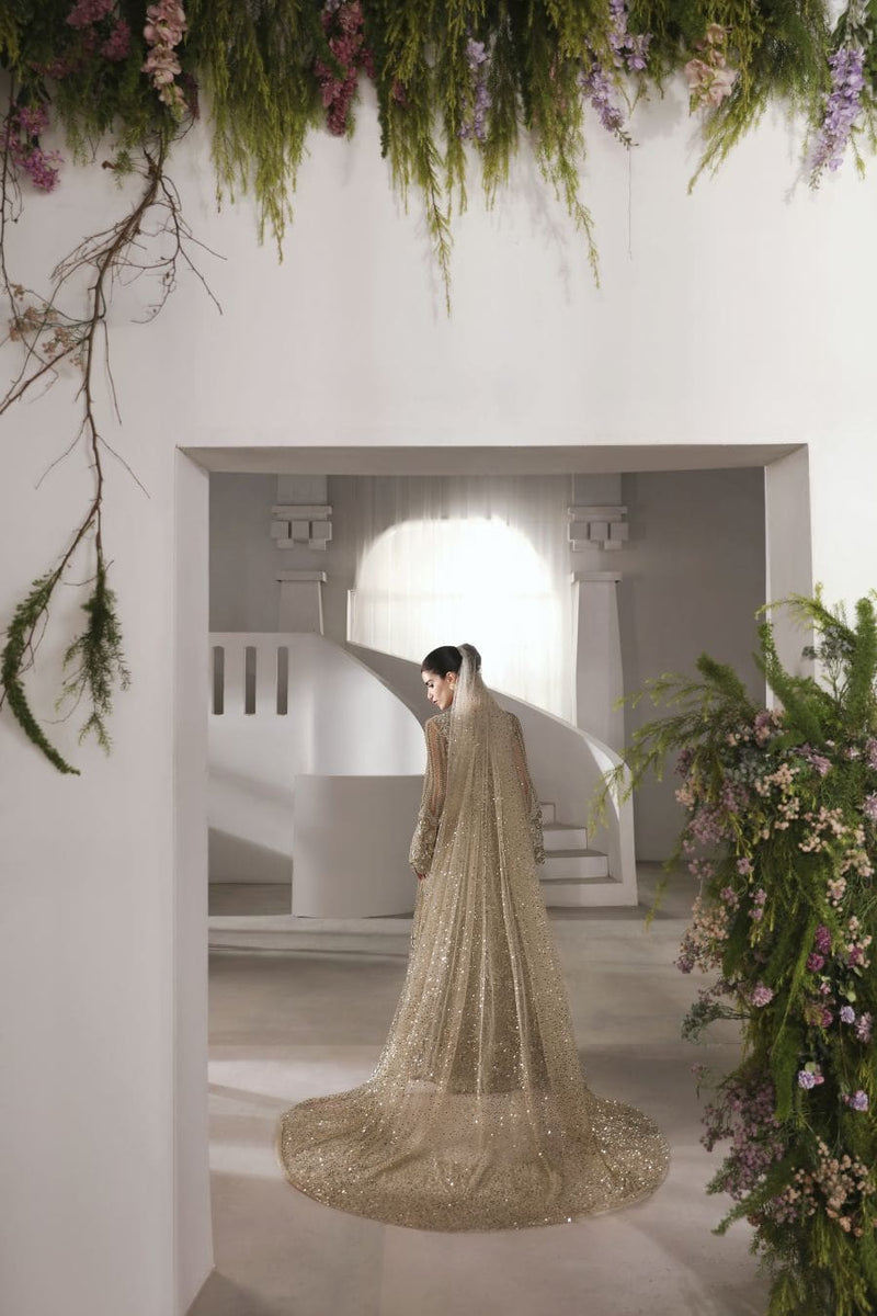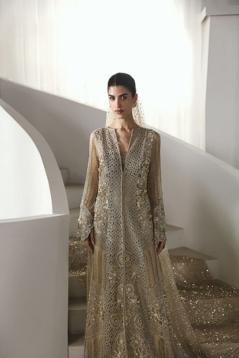 Indulge in the captivating "A Symphony of Gold," a gown that embodies pure enchantment. This exquisite ensemble features a net gown and veil, opulently hand-embroidered and encrusted with shimmering crystals. A luxurious palette of golds and champagnes creates a breathtaking spectacle, while the sumptuous raw silk inner ensures unparalleled comfort.
