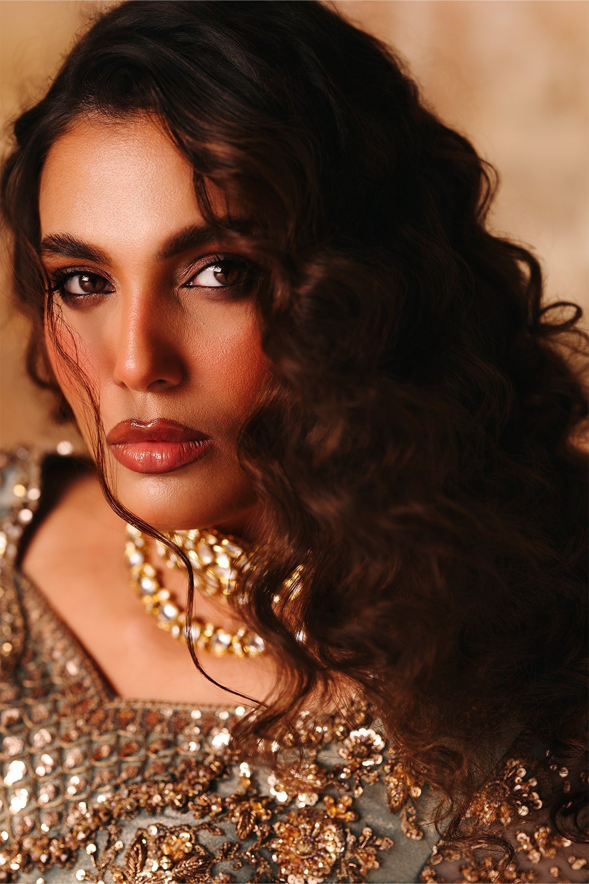 Completed with a subtly adorned net dupatta with dense sequin spray and 4 side sequin borders, this timeless design in muted gold-olive tones is perfect for weddings, festive gatherings, and formal occasions.