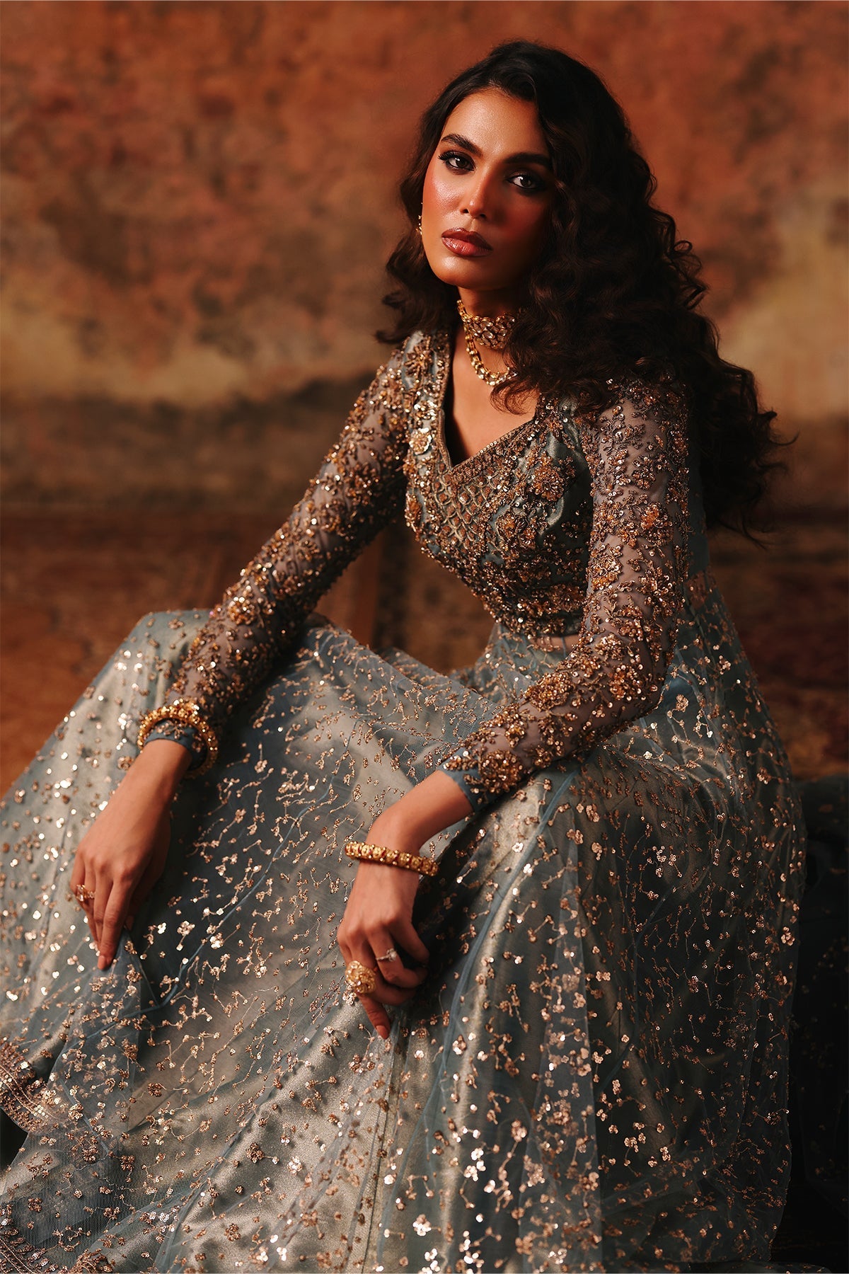 Description: An elegant ensemble featuring a delicately embellished Blue pishwas, detailed with fine handwork on the bodice and sleeves for a refined, graceful look. The panels are embroidered beautifully with dense sequin work. The pishwas is paired with a flowing tissue sharara, adding a soft sheen and fluid movement to the silhouette.