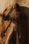 Description: An elegant ensemble featuring a delicately embellished Gold net pishwas, detailed with fine handwork on the bodice and sleeves for a refined, graceful look. The panels are embroidered beautifully with dense sequin work. The pishwas is paired with a flowing tissue sharara, adding a soft sheen and fluid movement to the silhouette.