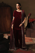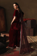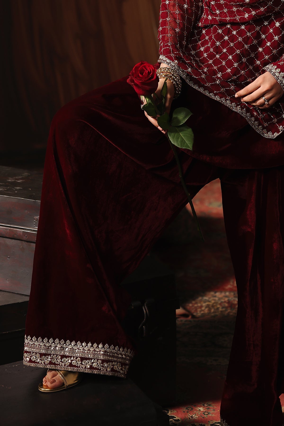A matching maroon velvet farshi shalwar, generously flared for that classic, regal sweep. The hem is richly embellished with intricate embroidery, giving the outfit a traditional yet luxurious finish. The fall and volume of the farshi create a beautifully dramatic silhouette.