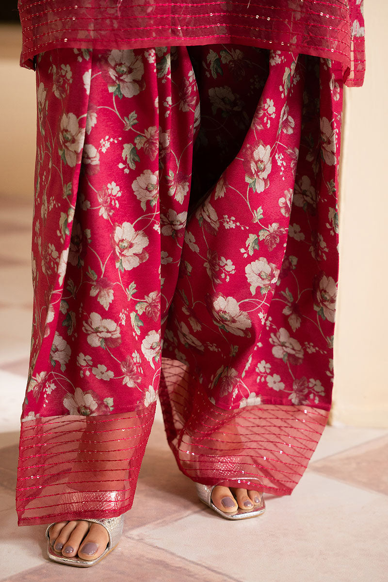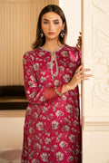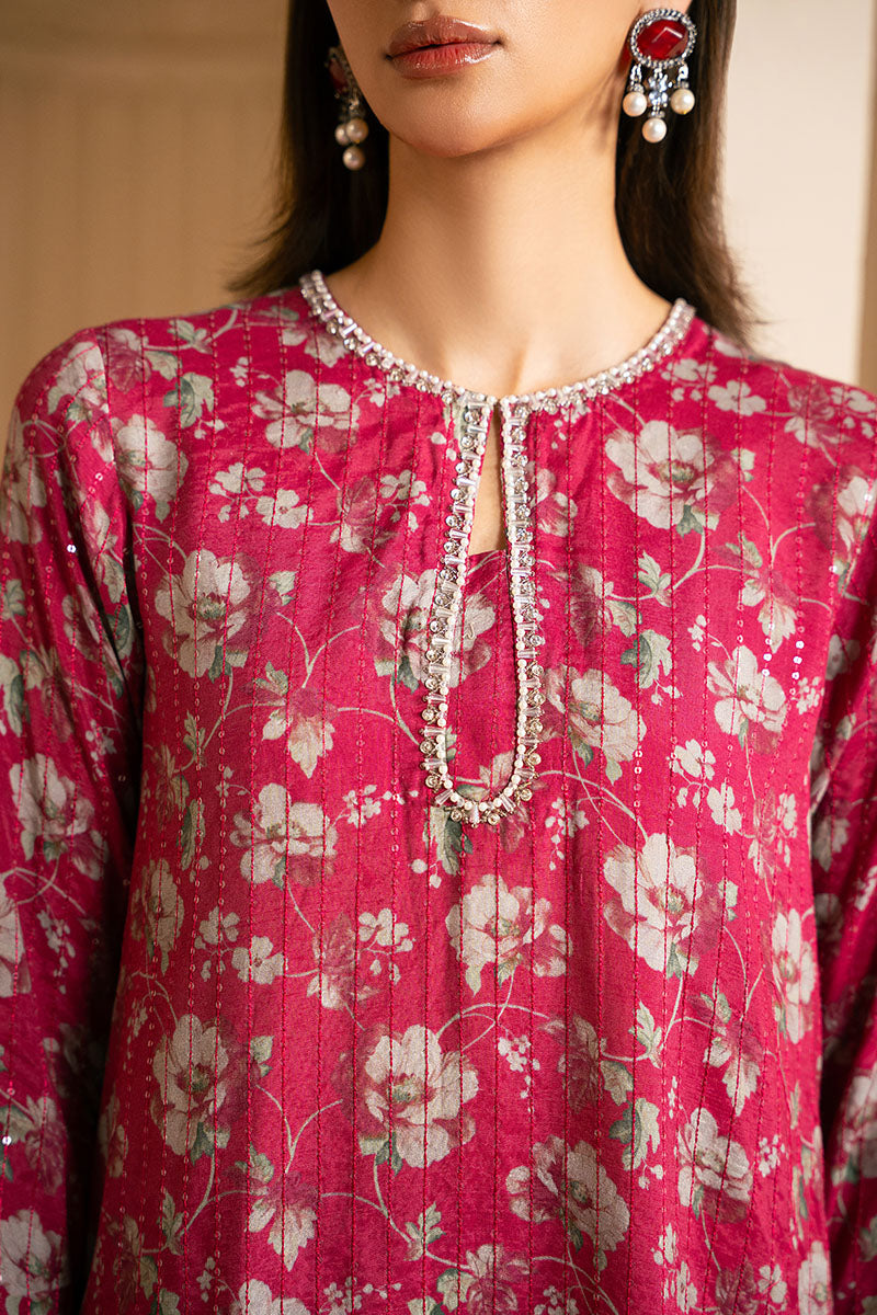 This silk shirt features a straight style with front and back embroidery and an embroidered border on the hem. The crew neckline is adorned with adda work, while the sleeves are fitted with an embroidered border and loop buttons. The silk trousers are printed and embroidered, and the outfit is completed with a chiffon printed and embroidered dupatta for a loose-fit shalwar.
