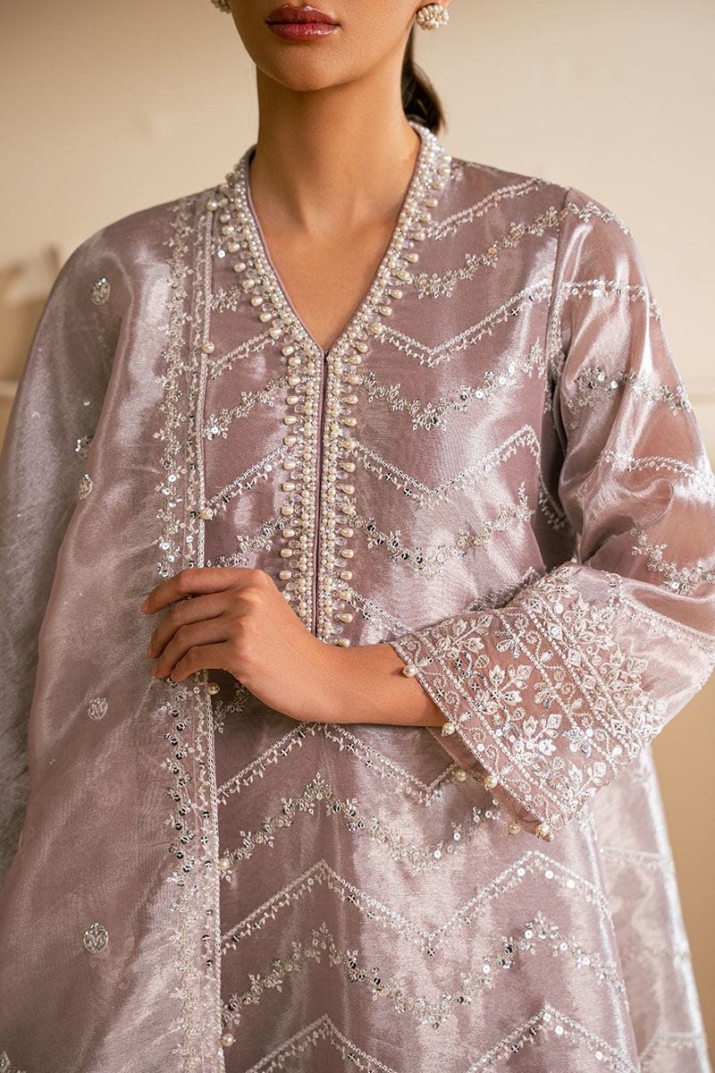 This 3-piece LILAC HAZE outfit features an A-line shirt with intricate sequin and pearl embroidery, as well as a high neck band with hand embellished details. The dyed and embroidered tapered shalwar creates a flattering silhouette, while the tissue dupatta adds a touch of elegance with its sequin embroidery.