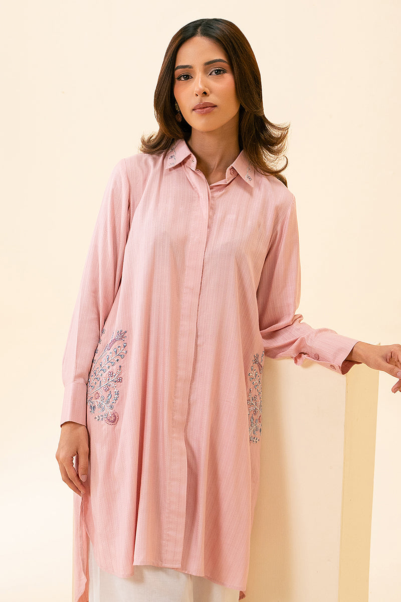 - This PINK BLISS EMBELLISHED LINEN SHIRT combines style and comfort with its button down design and linen fabric. The front features a beautifully embroidered motif patch, while the back is plain dyed. The collar is adorned with an embroidery patti, adding a touch of elegance. The straight sleeve and cuff detail complete the look of this sleek shirt.