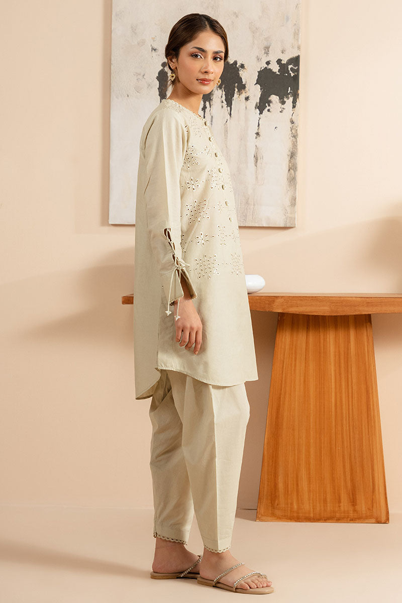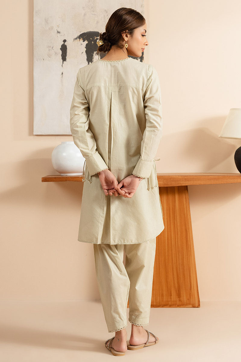 The PRIMROSE -2 PC (SHIRT & TROUSER) features a round hem shirt made of lawn fabric. The front is uniquely dyed and embroidered, while the back has a round hem and dyed back with a yoke and pleat. The neckline is a classic crew neck with a placket, lace, and tasseling detail. The regular sleeves are accented with a cuff and tasseling detail. The accompanying trouser is also made of dyed cambric fabric and has a tapered design for a polished look.