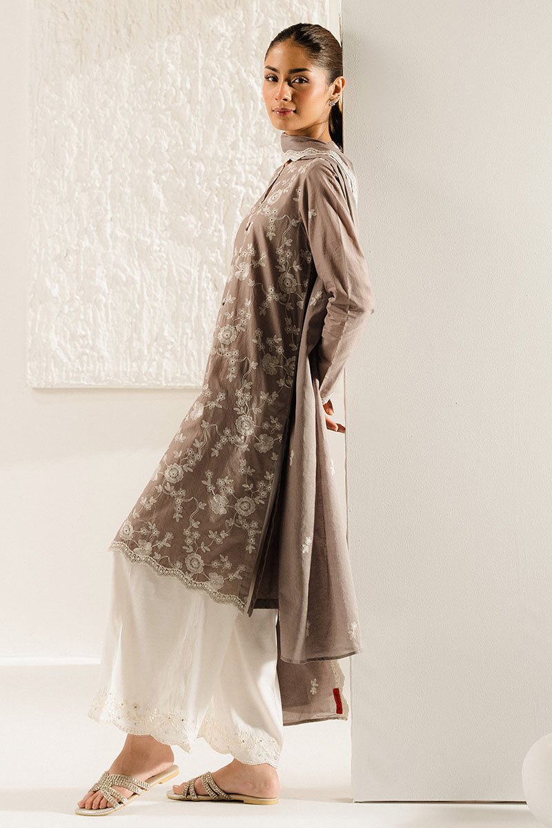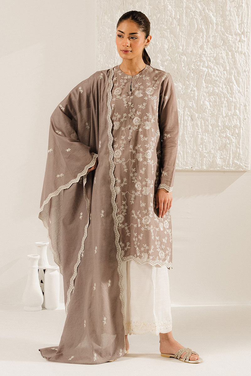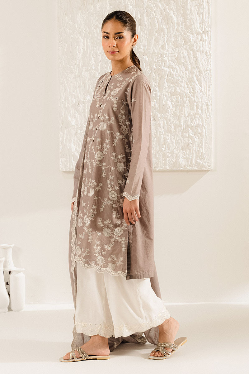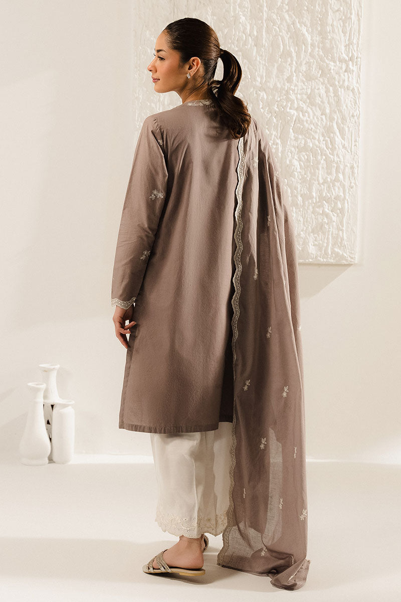 Expertly crafted with a straight short style and embroidered detailing, the TRANQUIL HAZE-2PC (SHIRT & DUPATTA) exudes elegance and sophistication. The front boasts intricate embroidery, while the back features a simple yet chic dyed design. The neckline is adorned with a flat band and slit with tasseling detail. Paired with a dupatta made of lawn fabric and adorned with delicate lace, this set is the epitome of grace.