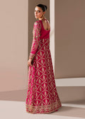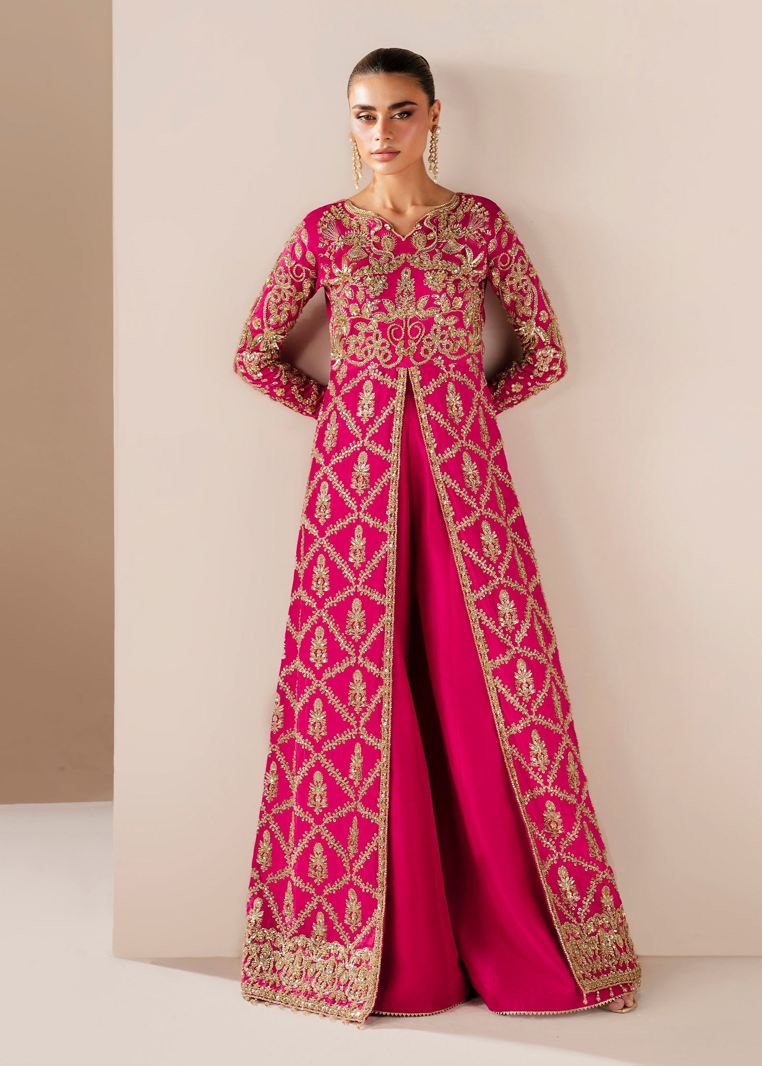 Radiating confidence and allure in every glimmer, this fuchsia gown is a vision of modern opulence. The front-open slit beneath the bodice adds a touch of bold femininity, while intricate embellishments of crystals and Swarovski stones illuminate its rich hue. Paired with pure silk sharara pants, it's where grandeur meets irresistible grace.
