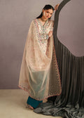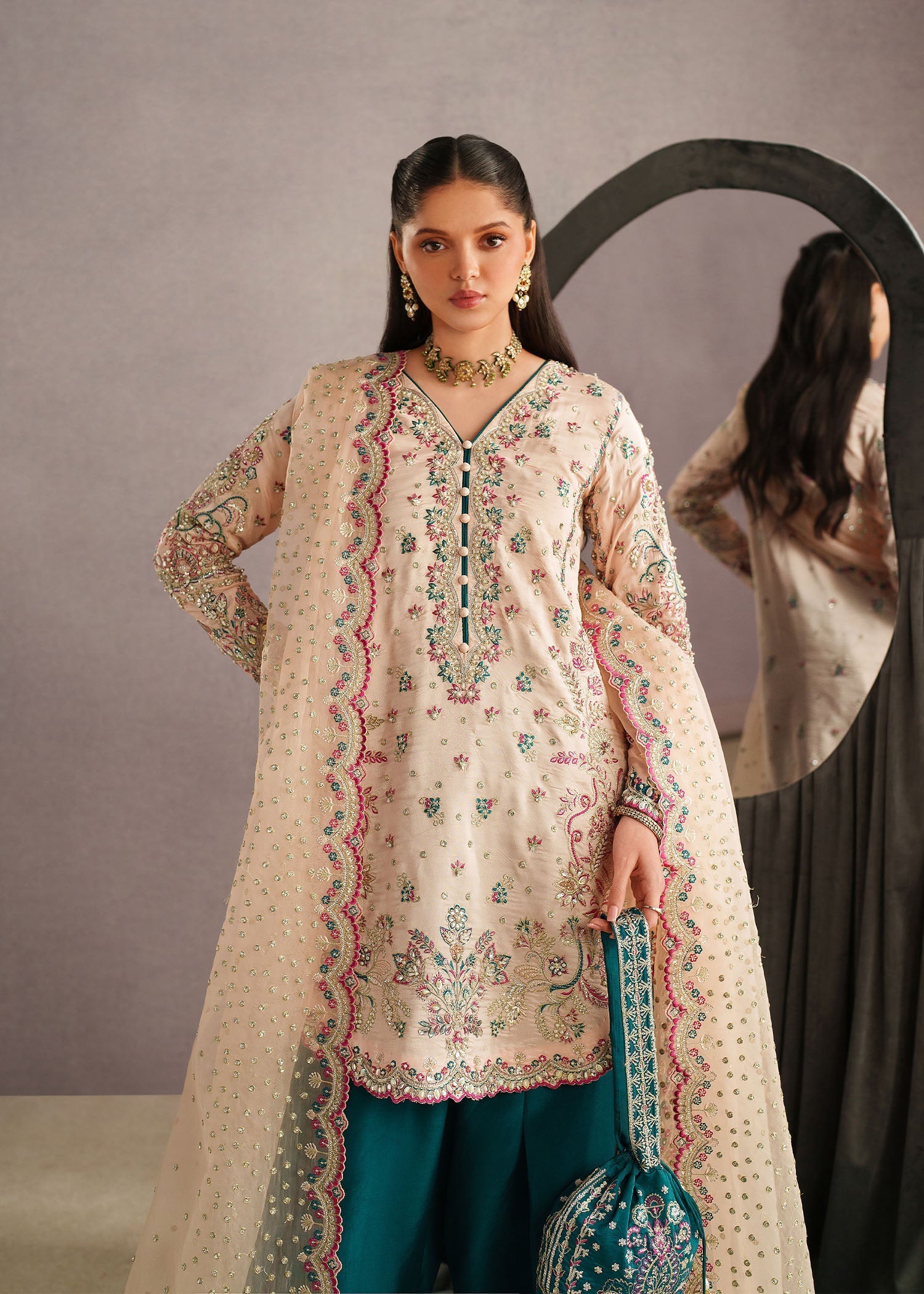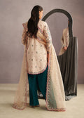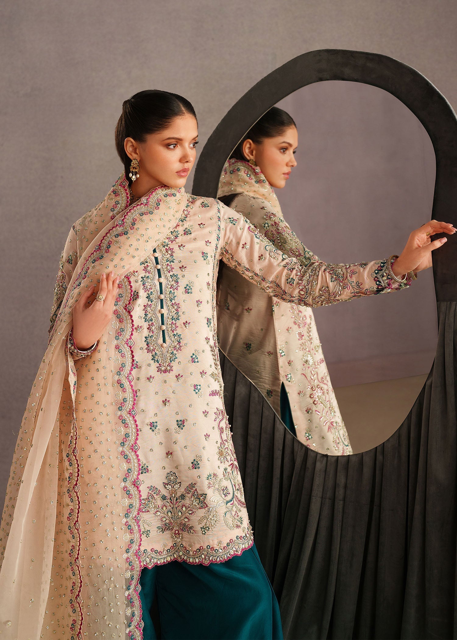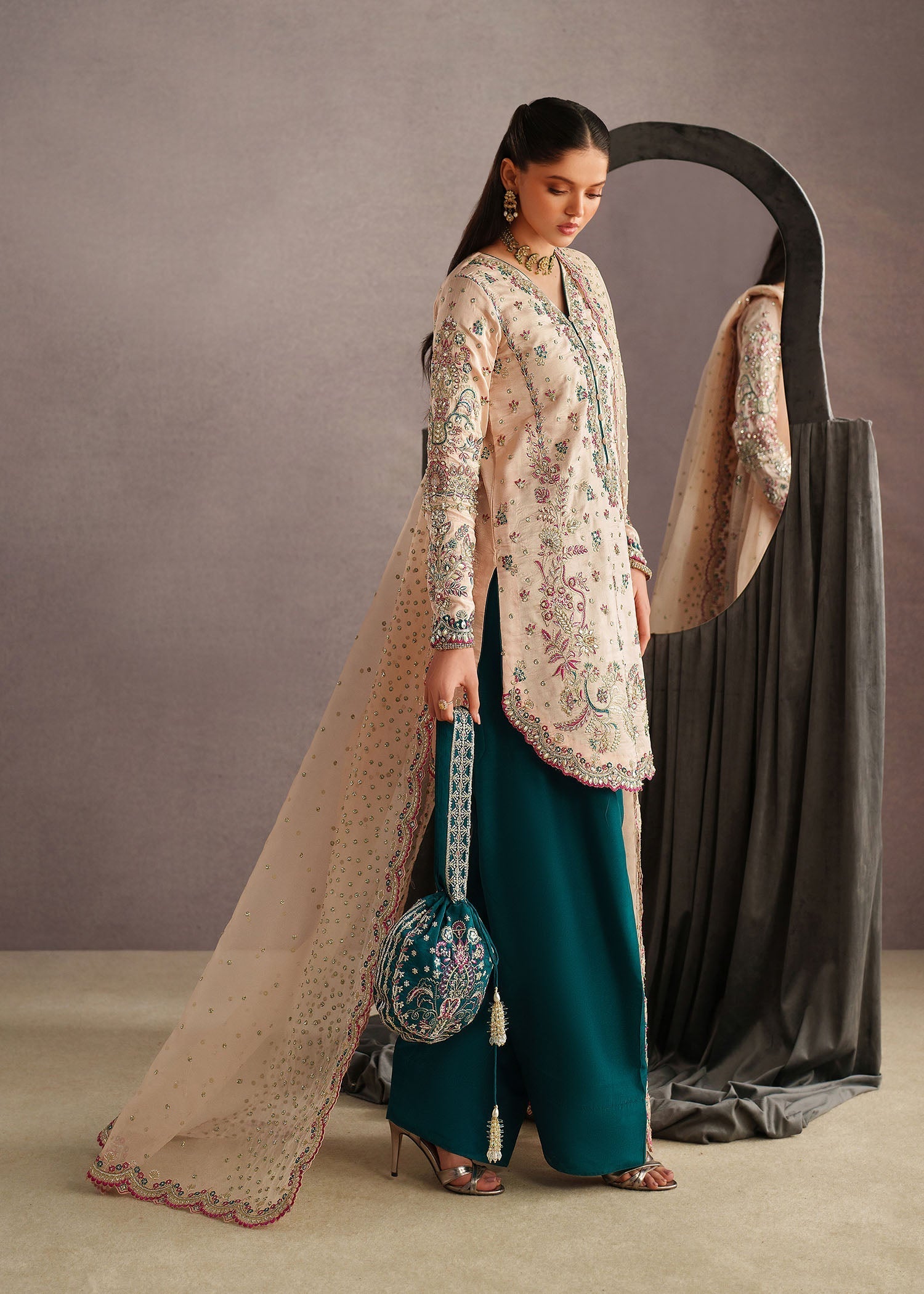 An elegant three-piece traditional outfit featuring a soft ivory embroidered kameez adorned with delicate floral motifs and intricate detailing along the neckline and hem. The kameez is paired with rich teal straight-cut trousers that add a striking contrast to the subtle base tone. Completing the look is a sheer ivory dupatta, beautifully finished with scalloped embroidered borders and scattered embellishments for a graceful drape. The ensemble is styled with minimal gold jewelry and a matching teal potli bag, creating a refined and timeless look perfect for festive Eid occasions or formal gatherings.