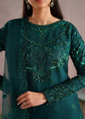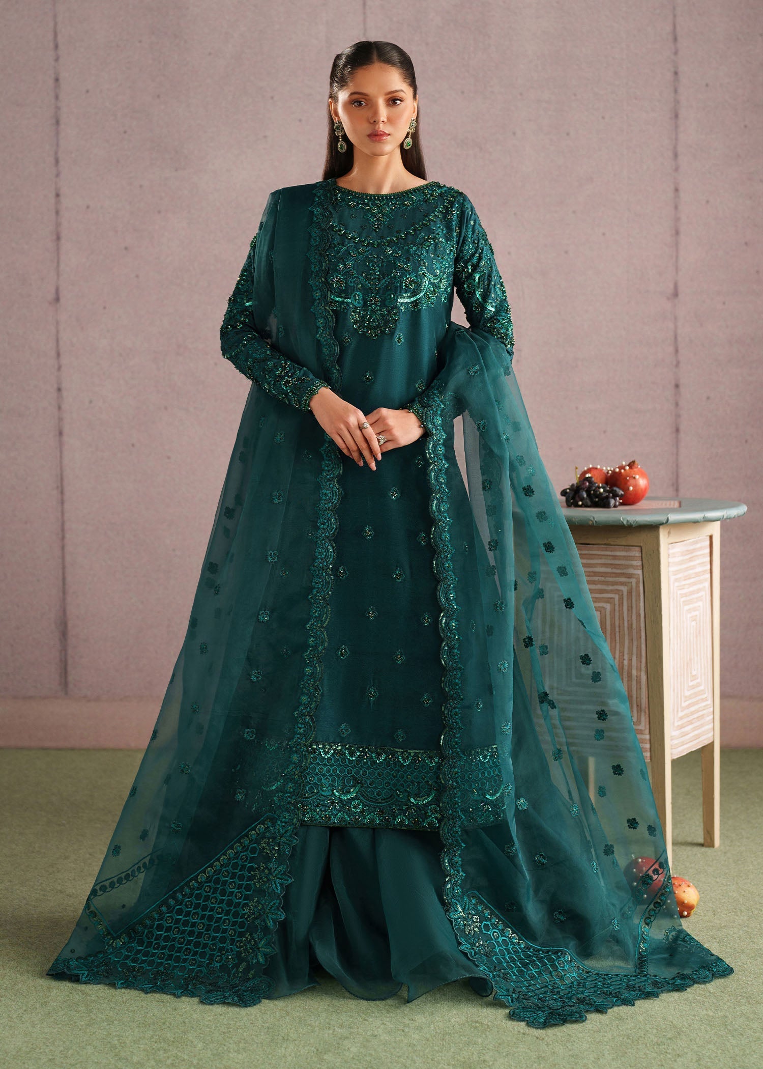 An elegant deep emerald green ensemble crafted in sheer, flowy fabric, adorned with intricate tonal embroidery and delicate embellishments throughout. The straight-cut long kurta features detailed handwork along the neckline, sleeves, and hem, creating a refined and graceful silhouette. It is paired with a matching flared sharara-style bottom that adds volume and movement. The look is completed with a sheer embroidered dupatta, finished with ornate borders that enhance its luxurious appeal. Perfect for festive occasions, weddings, and formal evenings, this outfit exudes timeless sophistication and regal charm.