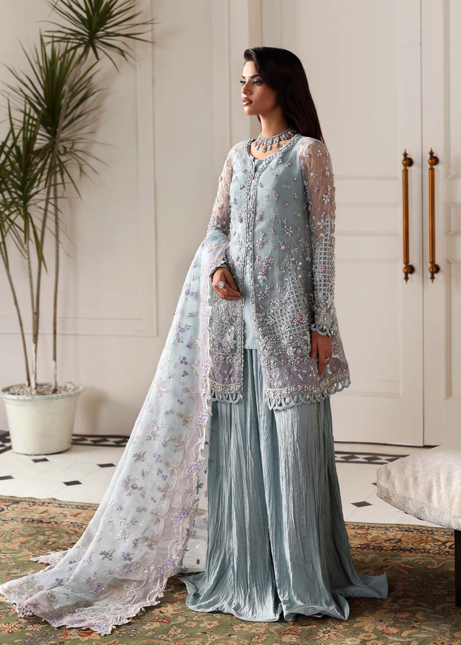 Eisley is our answer to the call for something truly different , a piece that doesn't just follow trends but creates its own moment. Drenched in Celestial Blue, a shade we dreamt into life, this outfit is soft yet striking, delicate yet bold designed to stand apart in a world of sameness. At its heart is a modern peplum silhouette, adorned with intricate embellishments that catch the light with quiet brilliance, paired effortlessly with crushed pants that add texture, ease, and flow. Every stitch, every shimmer has been crafted with celebration in mind €” thoughtful, graceful, and full of soul. Eisley is more than fashion; it's expression €” a look that speaks before you do. Available in stitched and unstitched options, but with only limited pieces released, this is one you'll want to claim before it's gone for good.