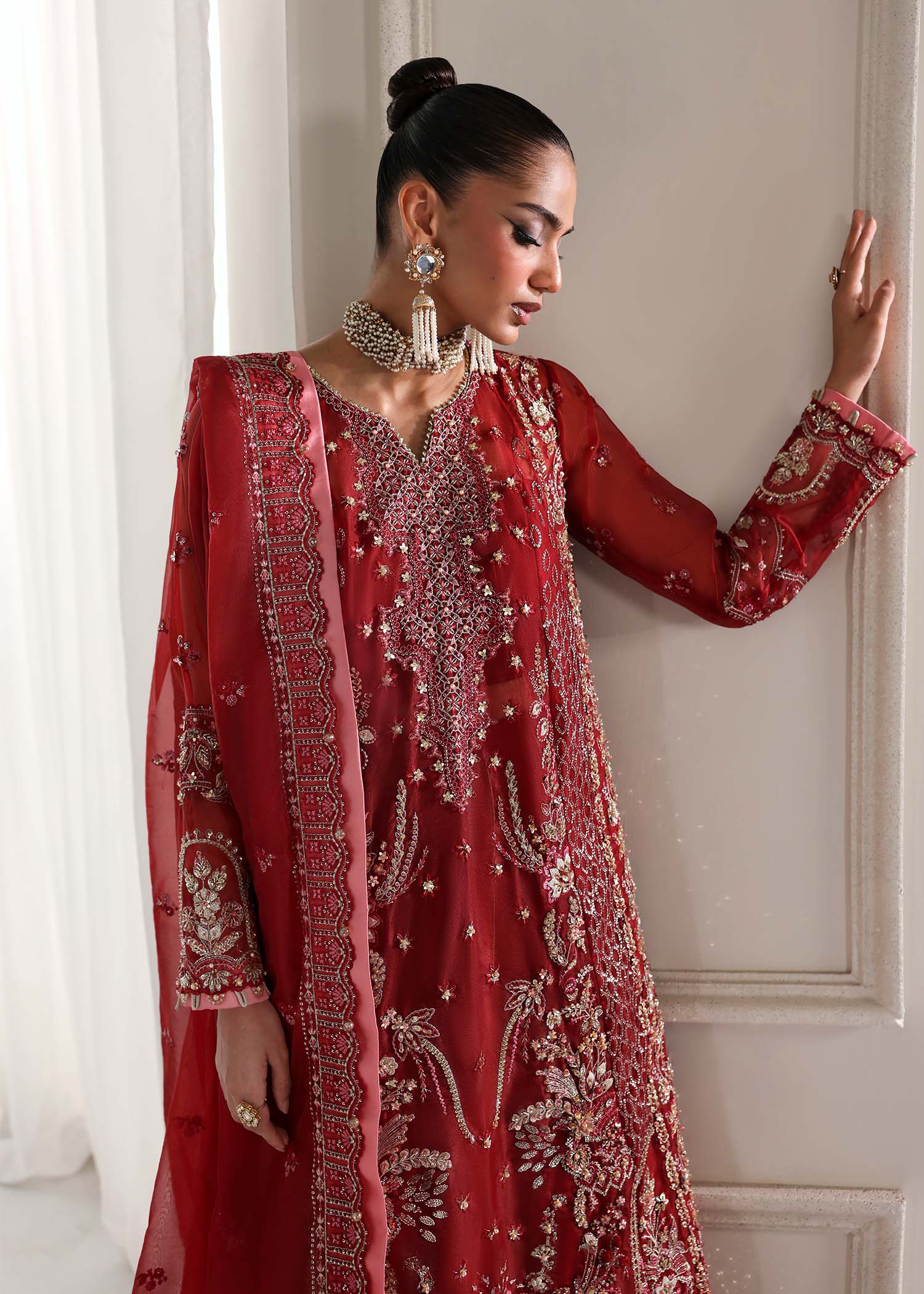 A powerful ode to festive tradition, LIVIA arrives in a bold, reimagined red , A colour that commands attention and celebrates confidence. Intricately adorned with a blend of geometric embroidery and soft florals, the outfit is elevated through silver threadwork, delicate hand embellishments, and glinting accents that add just the right touch of sparkle. The composition plays with depth and detail, creating a surface that feels rich, layered, and strikingly modern. Finished with meticulously worked borders and an elegantly adorned dupatta, Livia captures the spirit of celebration in every stitch ,available in both stitched and unstitched,so you can make it entirely your own.