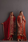 This piece celebrates the poetry of opulence and heritage, rendered in a deep burnt orange base that symbolizes festivity and grace. The surface is richly hand-embroidered with zardozi, resham, crystals and kamdani, creating a tapestry of intricate floral vines and ornamental borders reminiscent of mughal jewelry craftsmanship. The shirt is crafted from kamdani chiffon and the Dupatta in kamdani organza the outfit comes with a pure raw silk Izaar hand worked in zardozi.