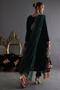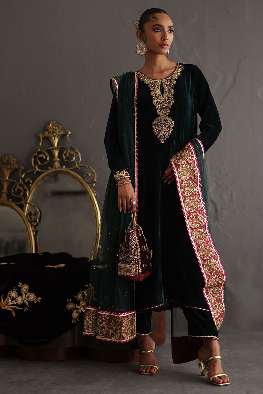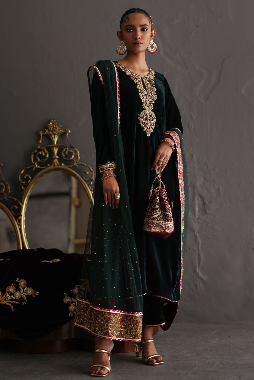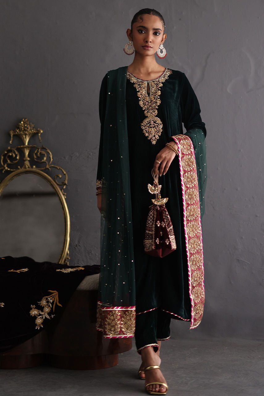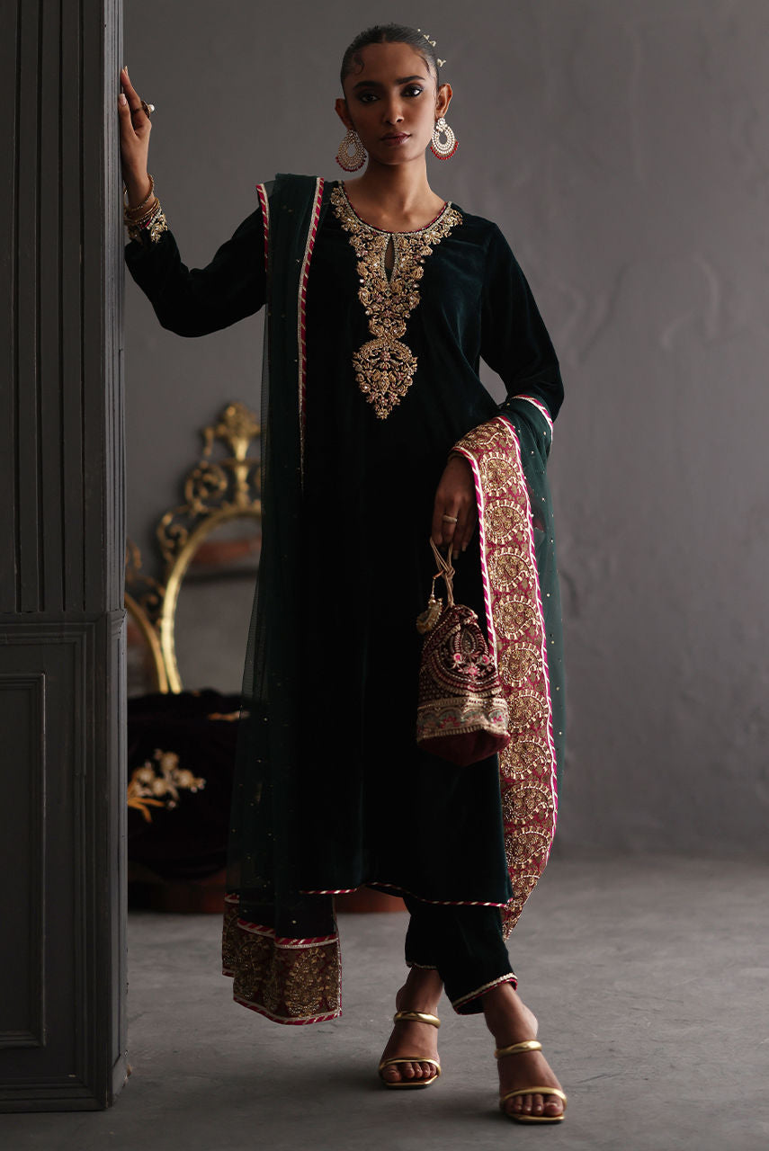 A forest green velvet ensemble with magenta accents, featuring exquisite zardozi work on the neckline and trousers. Styled with a French net dupatta adorned with a block printed handworked border and delicate sequin detailing for a refined, festive finish.