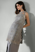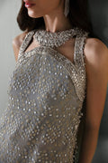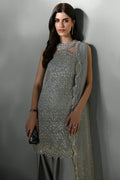 Élan Luxury Prêt unveils Éclat de Glace, a resplendent creation in silvery-grey that epitomizes contemporary luxury and effortless glamour. This stunning ensemble commands attention with a statement crystal-encrusted neckline€”a flawless stroke of brilliance exuding an aura of opulence. Every detail is a work of art, from the hand-crafted embellishments that shimmer exquisitely with each movement to the tonal raw silk shalwar adorned with delicate cut-dana and sequin motifs, evoking the allure of stardust woven seamlessly into fabric. Completing this masterpiece is a pure organza dupatta edged with intricate scalloped embroidery and encrusted with glittering sequins, radiating an ethereal elegance that leaves a lasting impression. Designed for the sophisticated woman who embodies grace with every step, Éclat de Glace is the ultimate statement of refined allure, ideal for intimate gatherings and grand fêtes alike