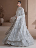 Elysian a celestial vision in grey white, where serenity meets splendour. The panni pishwas, opening gracefully at the front, flows into a regal lehnga and gossamer dupatta. Embellished with thread work, tilla, cut dana, batki, pearls, crystals, panni, and sequins, it glistens like moonlight upon silver mist. Elysian transcends couture €” a reverie woven in grace, radiance, and divine craftsmanship.