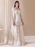 Noore is a vision in white, a short kurti exquisitely paired with a flowing sharara. It is a panaroma of artistry, where traditional Tilla embroidery and delicate cut dana are illuminated by the sparkle of pearls, crystals, and mukesh. Each detail, from the shimmering sequins and batki to the subtle glint of mirror work, has been thoughtfully placed. Blooming with intricate 3D flowers and finished with gotta work, this ensemble doesn't just capture light, it becomes it.