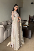 A front-open embroidered & embellished gown on net, paired with a printed long shirt, printed sharara, and a delicate net dupatta. Minimal, classy, and effortlessly elegant.