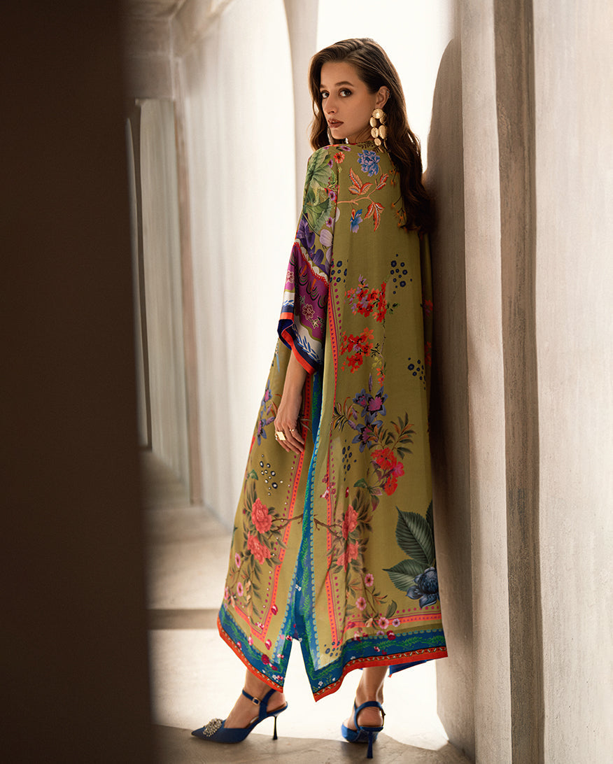 Elevate your wardrobe with our exquisite Sharmose Silk Kaftans, designed for effortless grace and timeless charm. Each piece showcases striking prints and features a luxuriously hand-embellished neckline, making it the perfect fusion of elegance and comfort.