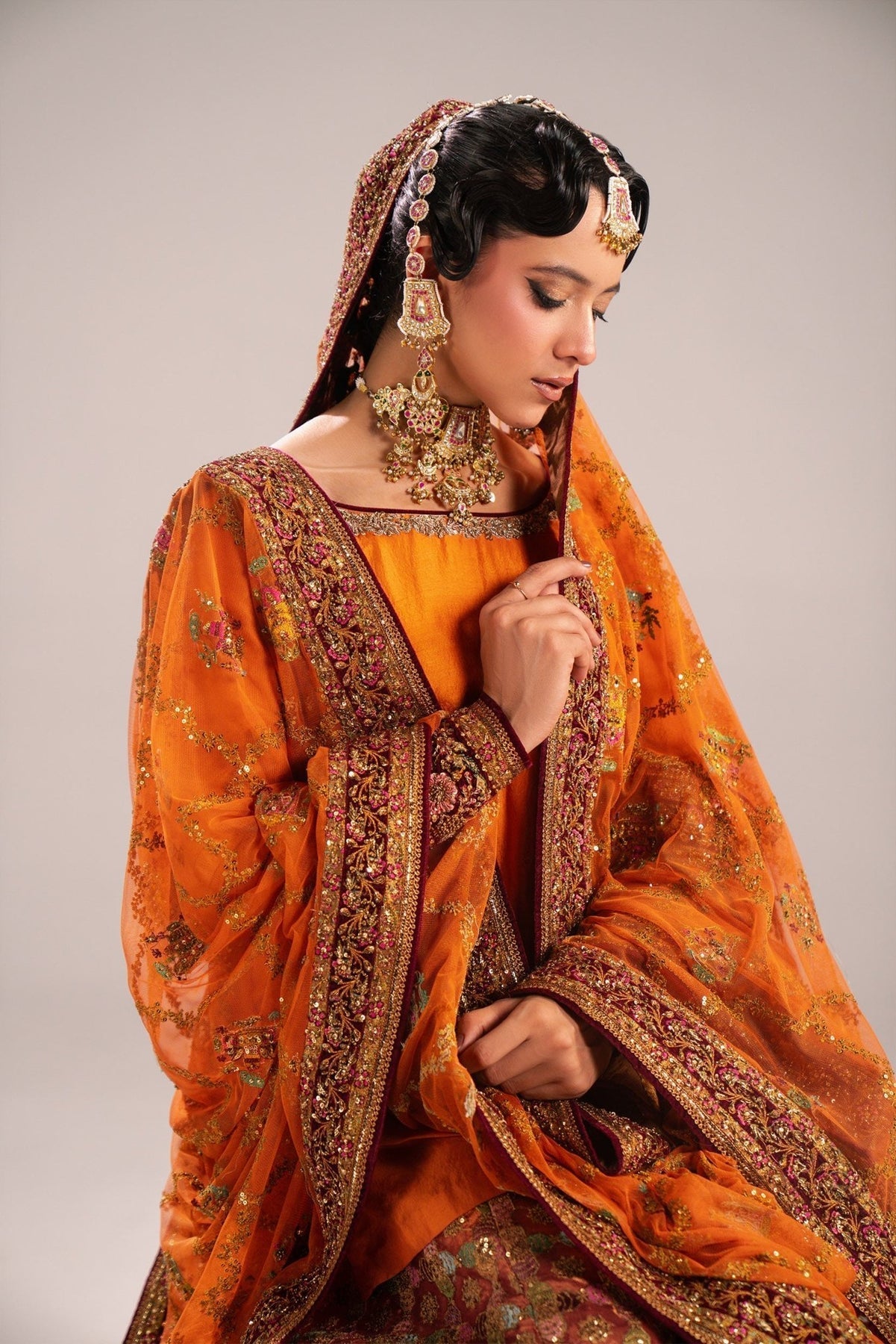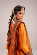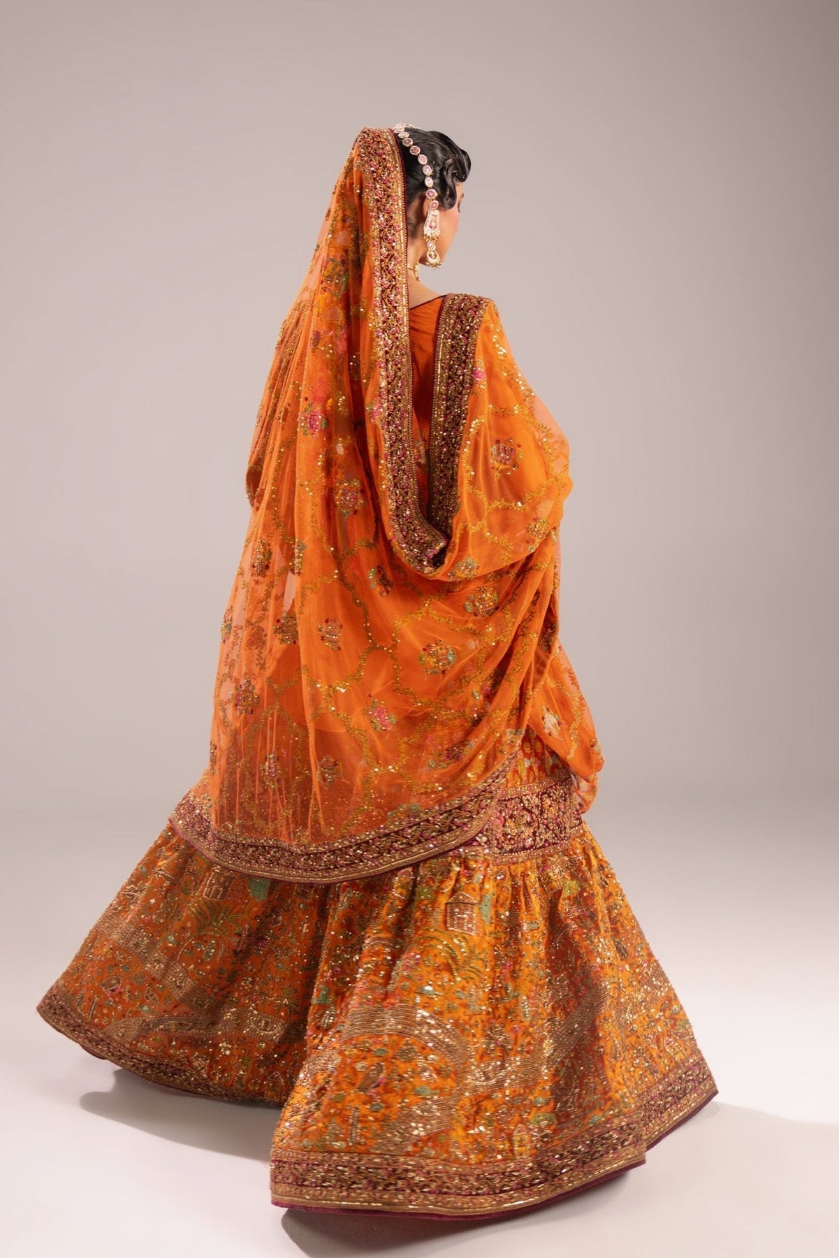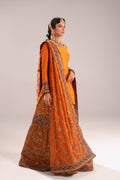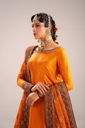 This stunning three-piece Gharara suit in striking tangerine orange.The top is a simple, long-sleeved raw silk kurta in solid, bright orange, allowing the gharara on tissue to be the focal point, featuring a deep orange base heavily adorned with intricate gold and bronze embroidery and sequin work.The look is completed by a sheer net dupatta in matching burnt orange, framed by wide, ornate gold borders finishes this opulent, festive look.