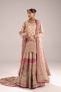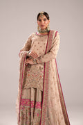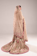 This lavish ensemble featuring a stunning contrast between soft neutral tones and vibran accents. The main color is a sophisticated champagne beige .A mid-length kurta in the champagne fabric, featuring intricate gold and silver zardozi embroidery across the body incorporating pastel threads.The lower garment is a voluminous traditional Dhaka plants with a strong, multi-tiered design. It is densely covered in mixed-media embroidery, featuring gold, silver, and colorful threads ,A sheer net dupatta in the matching champagne color heavily embroidered with scattered motifs. It features a striking, thick fuchsia pink piping border that runs along the entire edge. The ensemble boasts an impressive long trail on the back of the pants, which is completely covered in embroidery.The overall effect is a glamorous contemporary take on traditional bridal wear, emphasizing rich texture and vibrant contrast.