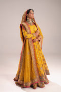 This regal full length Anarkali style gown is a luminous mustard yellow. The entire outfit is heavily embellished with fine embroidery and shimmering sequin work in a scattered floral pattern.The most striking feature is the use of contrasting borders on the hem of the gharara pants and the matching sheer dupatta are richly decorated with intricate embroidery work .The overall ensemble is opulent and designed for a major formal event, such as a mehndi or wedding celebration.