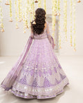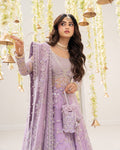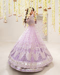 Poised and polished, Pinar is a vision of quiet glamour. The soft-toned, lilac net front bodice jacket drapes elegantly, tracing delicate lines that flatter and flow with its artfully arranged embroidery patterns. The printed and embroidered Shamose silk lehnga further enhances the ensemble’s sculptural silhouette. Paired with a flowy chiffon dupatta, this piece captures the essence of festive refinement with understated elegance.
