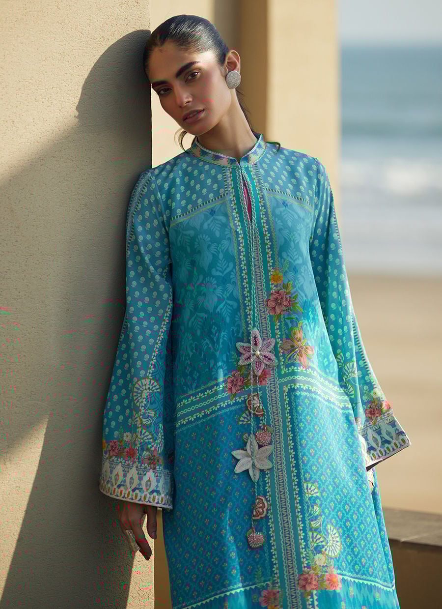 Farah Talib Aziz | Laani The Kaftan Edit | Amaris Sky-Blue Crepe