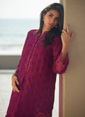 Cut from pure, breezy raw silk, this loose-fit A-line shirt is destined to become a wardrobe favorite. A vibrant magenta hue is brought to life with intricate silk-thread schiffli trellis embroidery, while the universally flattering neckline and sleeves are adorned with lustrous Swarovski crystals, pearls, and sequins, adding a subtle shimmer. The corners of the shirt are decorated with stunning embroidered cutwork. Flowing gracefully, this shirt is the perfect blend of effortless sophistication and playful elegance.