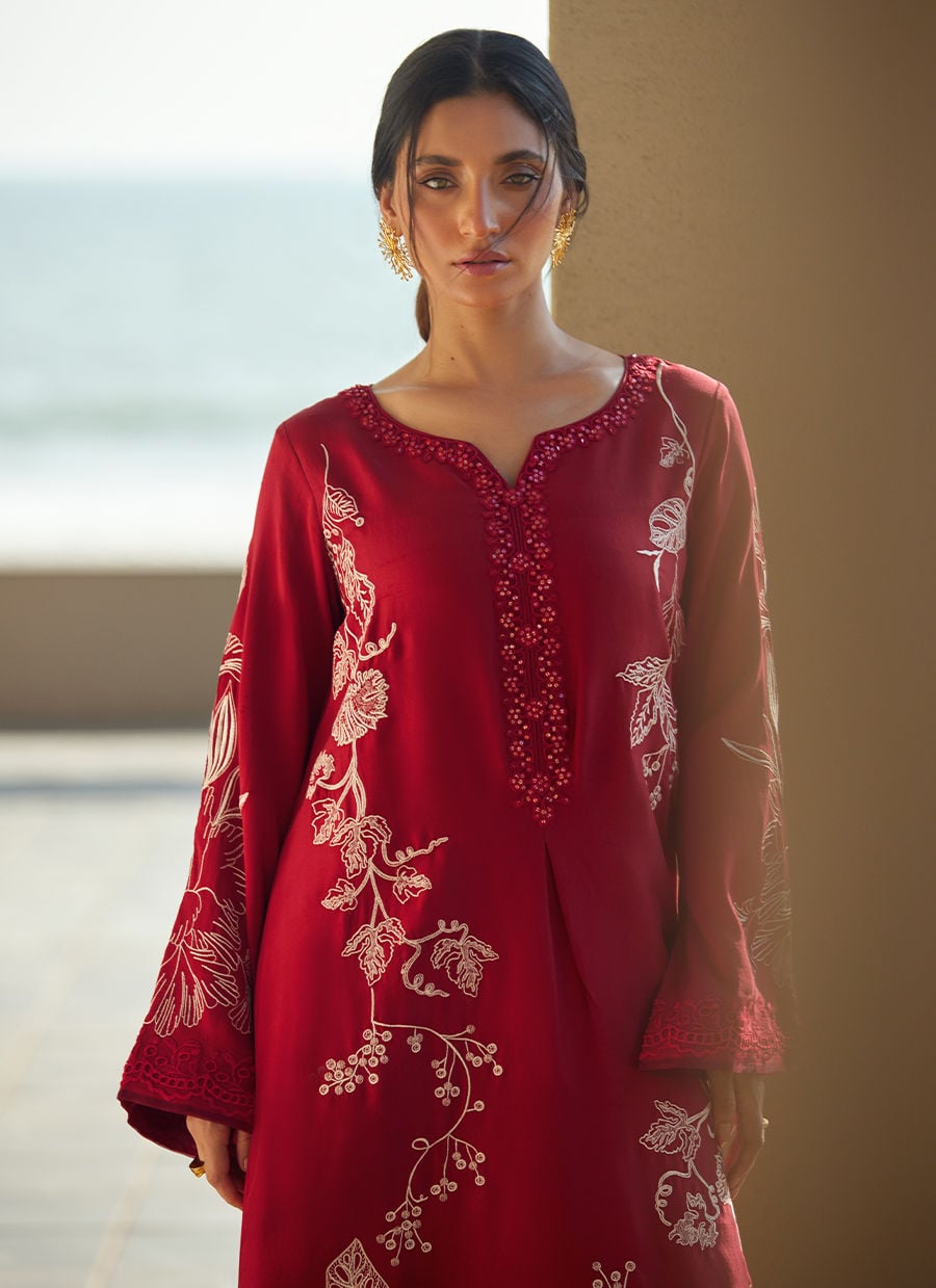 Bold and captivating, this deep scarlett, raw silk kaftan is intricately embroidered with ivory blooms and features a hand-embellished neckline for a touch of refined sparkle. The appliqued schiffli border adds structure and sophistication, completing a look that is effortlessly striking and timelessly elegant.