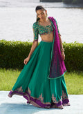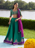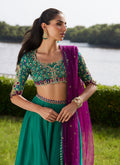 A vibrant ode to craftsmanship and color, this emerald and purple ensemble brings together traditional artistry with modern finesse. The block-printed choli shimmers with intricate handwork €” kora, dabka, nakshi, resham, and crystals €” creating a tapestry of texture and light. Paired with a delicately hand-embellished deep purple net dupatta and a graceful raw silk lehenga finished with subtle embroidery and playful tassels, this look is equal parts striking and sophisticated €” made to dazzle at any festive celebration.