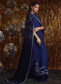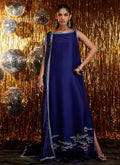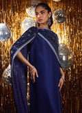 Inspired by celestial beauty, this deep navy kaftan-style dress captures the allure of the northern lights through exquisite silver crystal embellishments that shimmer with every movement. The fluid silhouette, cut from pure raw silk, exudes modern elegance while retaining a touch of old-world glamour.