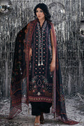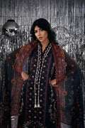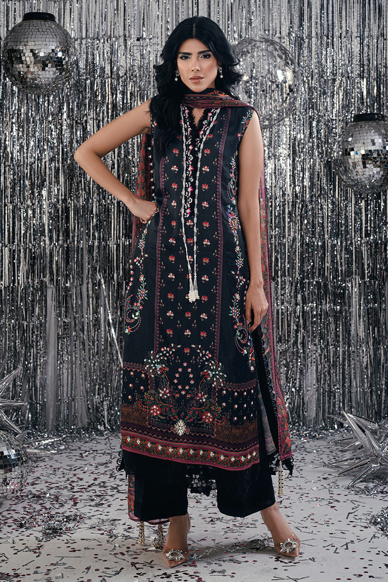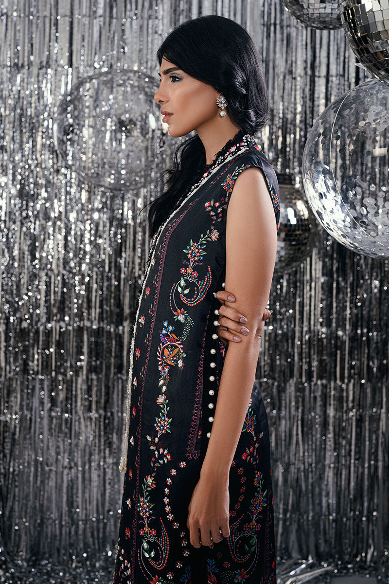 A captivating black digital-printed long shirt featuring an intricately hand-embroidered neckline adorned with delicate tassels and refined handwork detailing. The design is elevated with fabulous raw-edge finishing, adding a contemporary charm to its classic silhouette. Paired with matching Russian silk trousers and a coordinated digitally printed dupatta, this ensemble radiates understated luxury and timeless elegance an ideal choice for evening affairs and festive occasions alike.