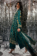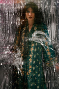An ode to regal elegance, Forest Veil enchants with its deep emerald canvas and self-digital print that exudes quiet luxury. The long-length shirt is beautifully accentuated with intricate gold handwork, rendered with finesse along the neckline and panels to create a statement of timeless sophistication. Delicate craftsmanship meets modern refinement through subtle detailing and a graceful silhouette, perfectly paired with coordinated trousers and a matching digitally printed dupatta. A masterpiece of understated opulence, Forest Veil embodies refined artistry designed for the woman who carries tradition with a modern spirit.