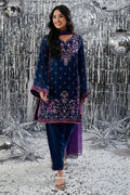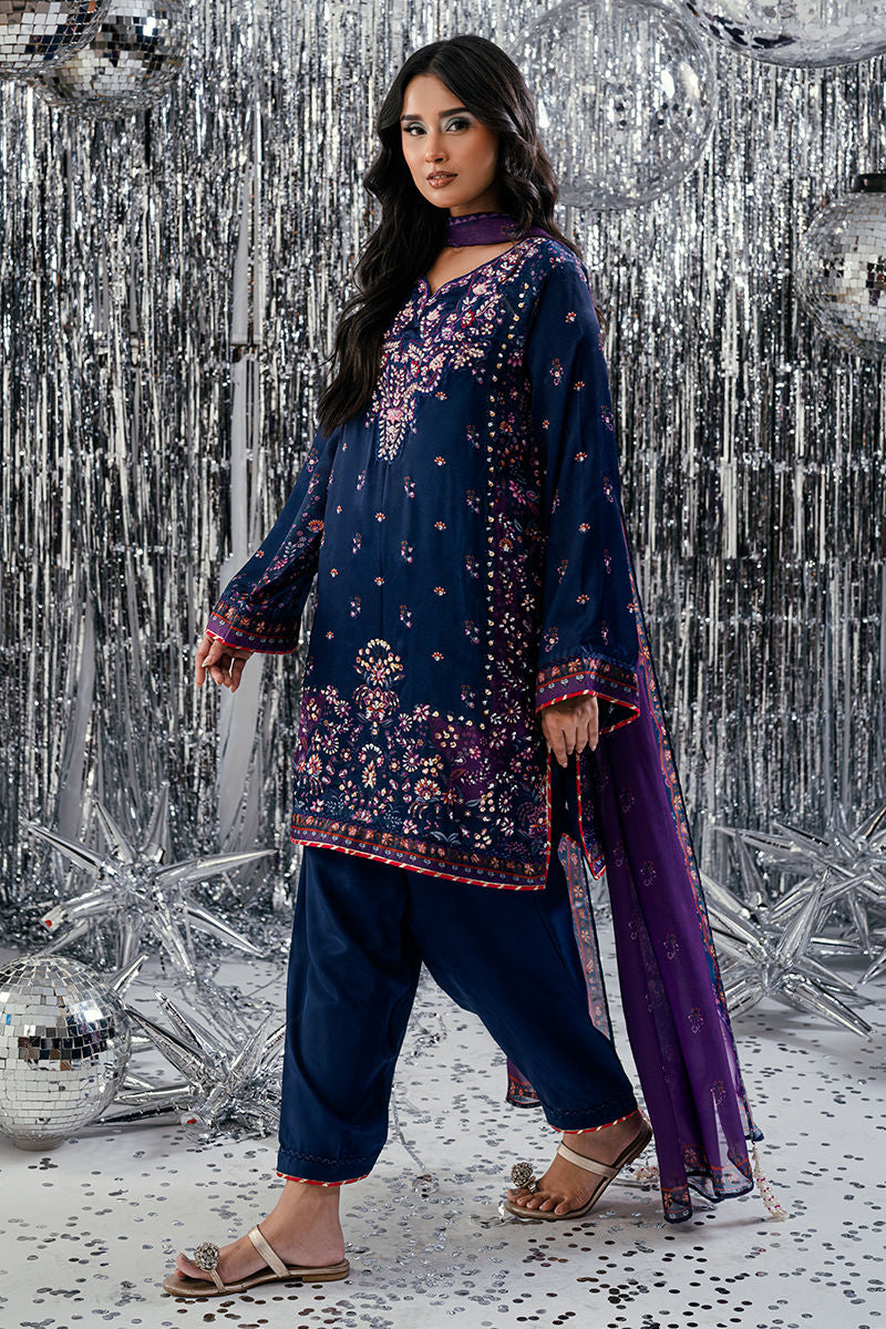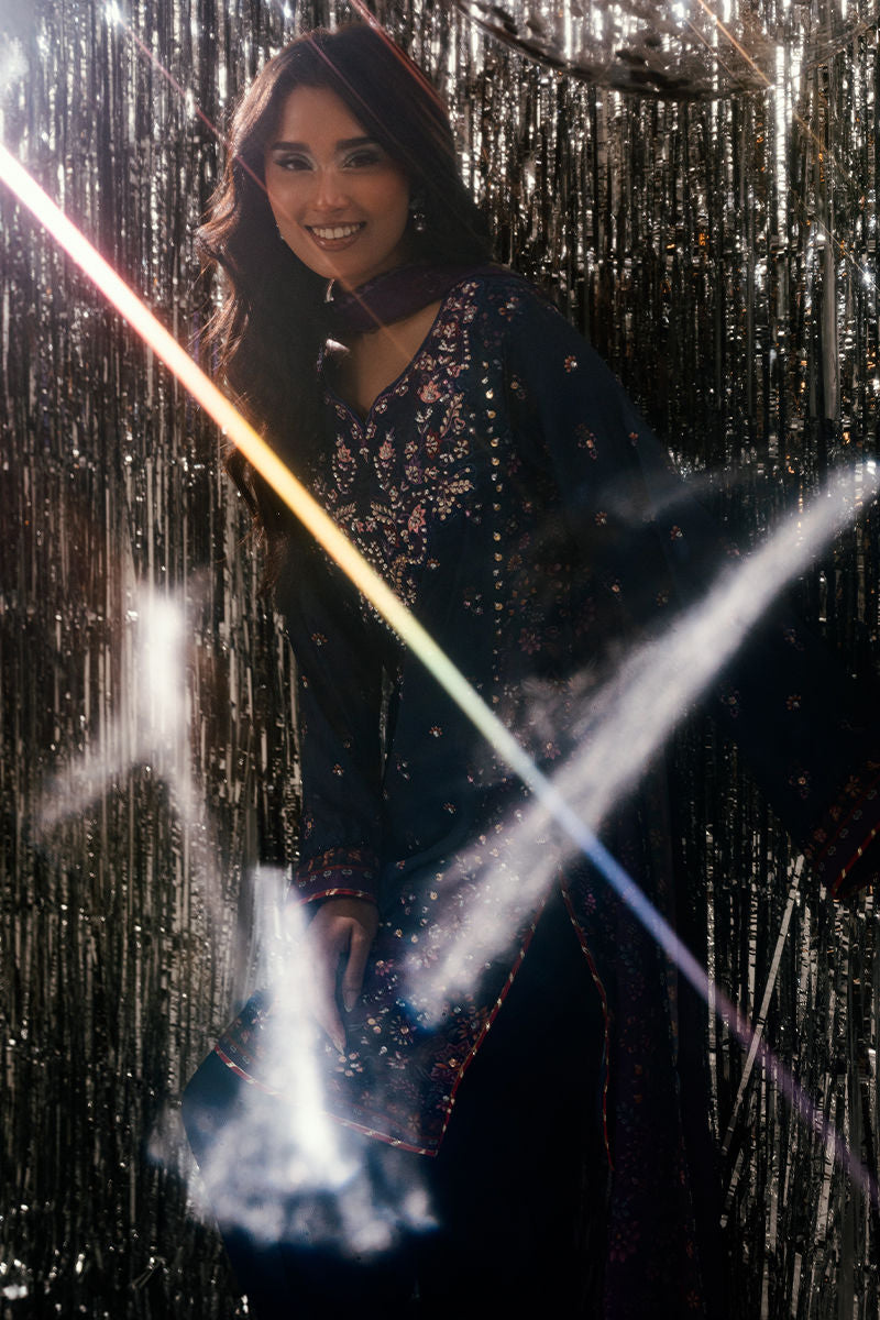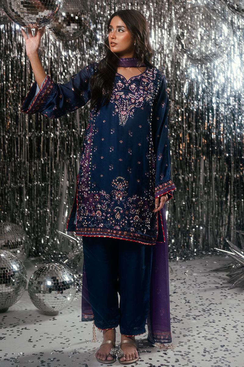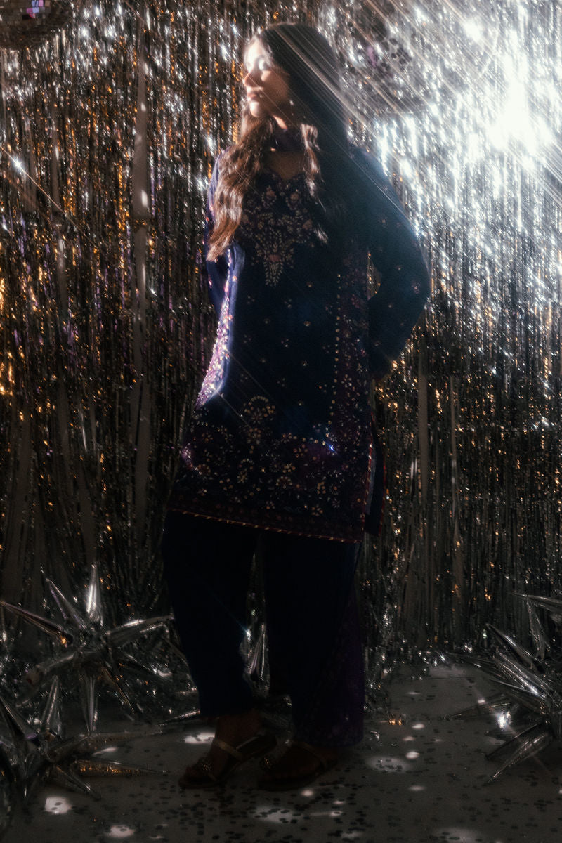 A captivating play of deep blue and regal purple tones, Midnight Amethyst exudes timeless sophistication. The short shirt is adorned with intricate handwork and delicate embroidery, adding subtle glamour to its rich color palette. Paired with a coordinated trouser and a beautifully composed digital print dupatta, this ensemble strikes the perfect balance between modern refinement and classic allure ideal for festive evenings and elegant gatherings.