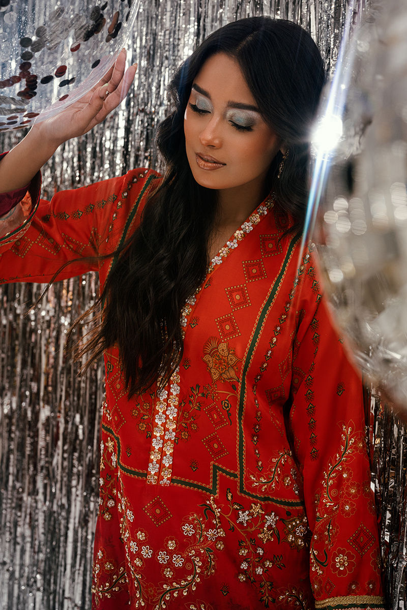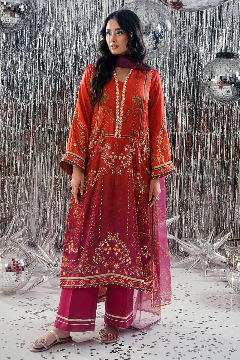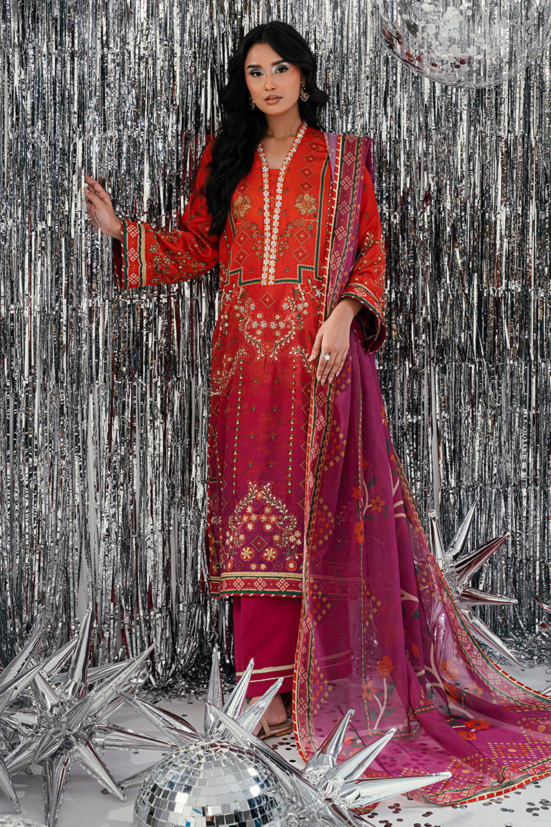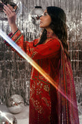 A radiant expression of color and craftsmanship, Sunlit Umber brings together shades of burnt orange and magenta in a mesmerizing digital print that reflects warmth and vibrance. The long shirt features a contemporary composition with refined detailing, exuding effortless sophistication and modern grace. Paired with coordinated trousers and a matching digitally printed dupatta, the ensemble creates a harmonious balance of tone and texture capturing the glow of twilight hues in motion. Elegant, timeless, and undeniably captivating, Sunlit Umber celebrates confident femininity through color, flow, and finesse.