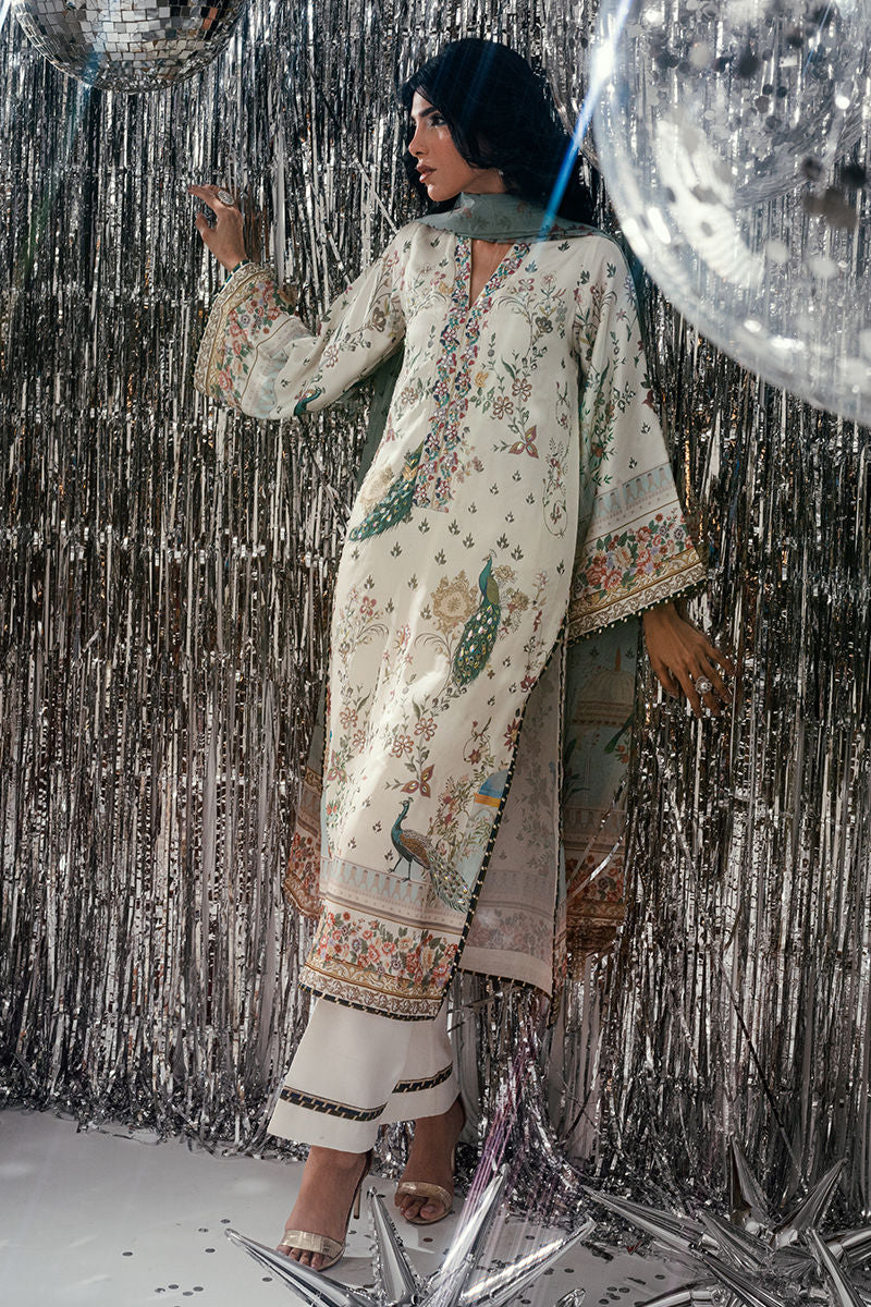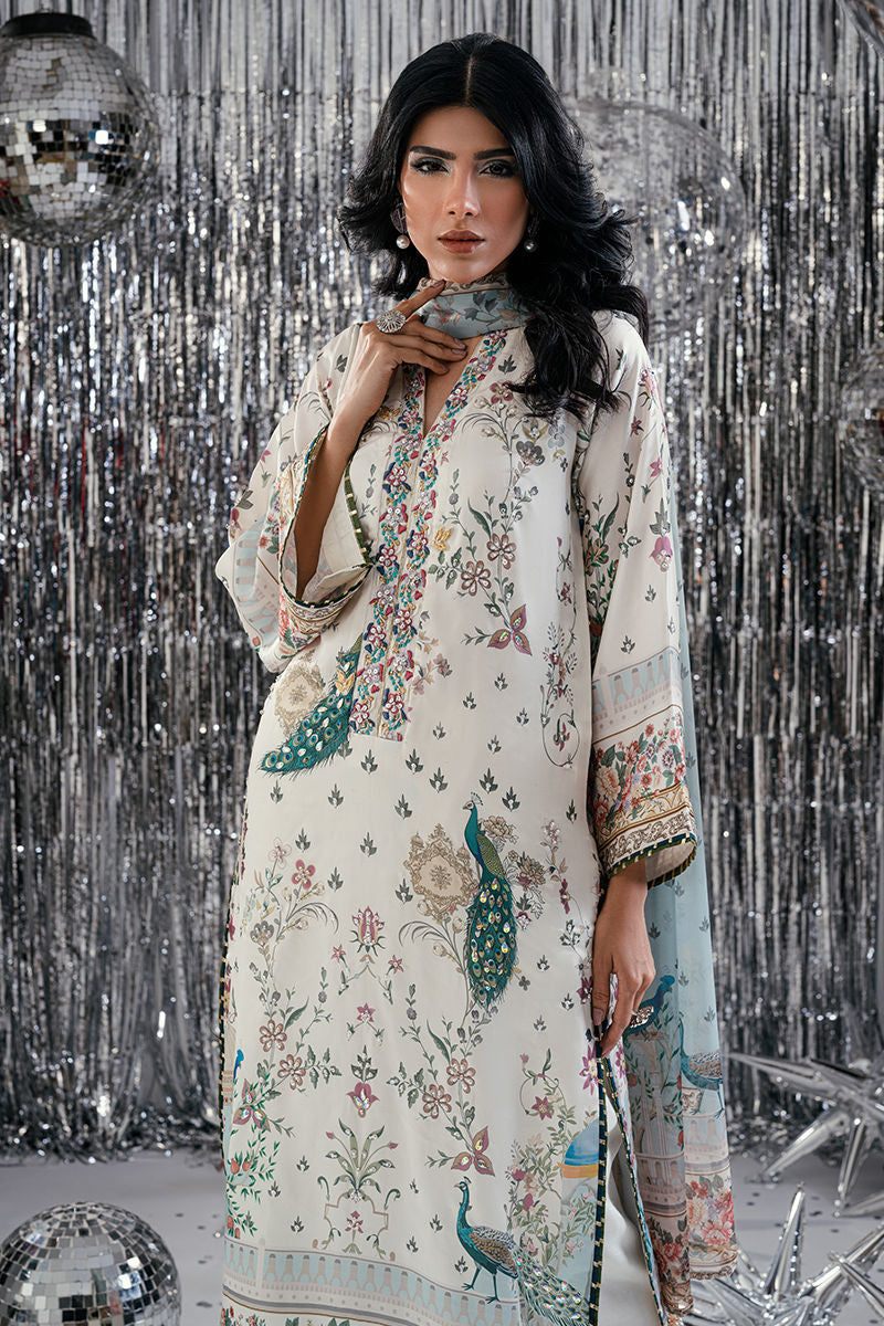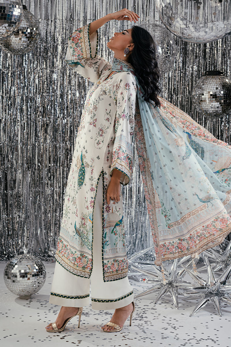 An ode to opulent artistry, Teal Peacock features a stunning digital-printed shirt adorned with majestic peacock motifs and intricate patterns that exude timeless allure. The design is enhanced with exquisite handwork, delicate embroidery, and fine embellishments that add depth and sophistication. Paired with a matching trouser and a beautifully coordinated digital print dupatta, this ensemble blends regal elegance with contemporary finesse perfect for festive occasions and graceful soirees.