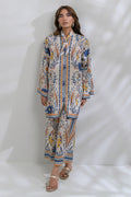Brighten up your wardrobe with this vibrant two-piece swiss lawn co-ord set featuring a beige base and bold hues of royal blue, sunflower yellow, and hints of burnt orange. This is a straight-cut front-opened style short kurta adorned with blue tassels and is paired with matching trousers that echo the same print. This set offers effortless sophistication and ensures comfort and style for your casual gatherings, brunch dates, or daytime festivities