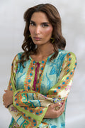Embrace a more sophisticated style with this elegant breathable shamooz silk kaftan, featuring a beige and light blue and chartreuse color palette. This is a long ankle-length kaftan with flowy sleeves which is finished with a contrasting tassel details on the neckline which makes it perfect for your summer affairs.